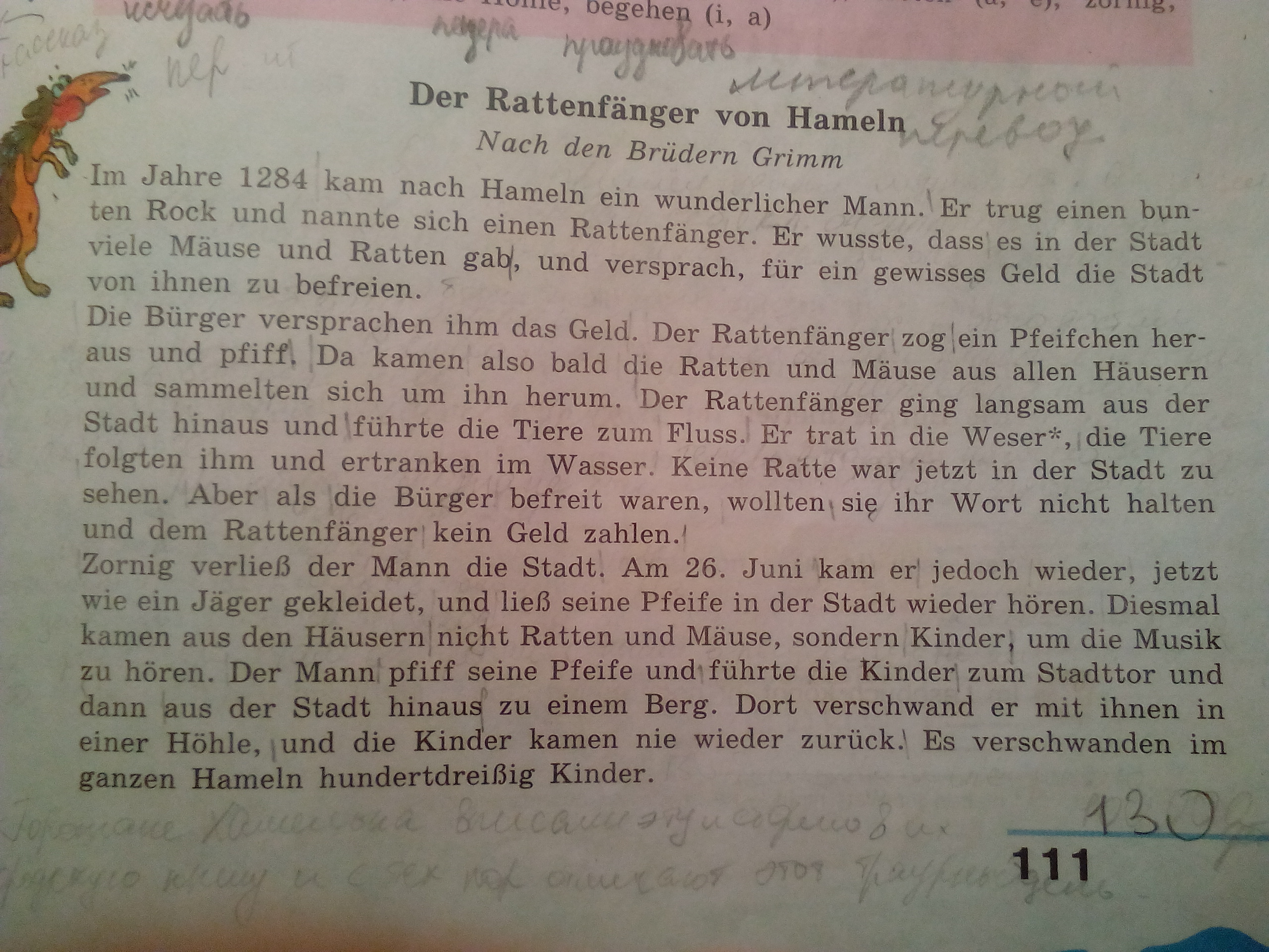 Горожане пообещали ему деньги. Тогда ловец крыс достал свистульку и засвистел. Вскоре из всех домов поползли крысы и мыши и собрались вокруг него. Ловец крыс медленно пошёл из города и повёл животных к реке. Он вошёл в Везер ( название реки), звери последовали за ним и утонули в воде. Теперь в городе не осталось ни одной крысы. Однако, когда горожане освободились от крыс, они не желали сдержать свое слово - оплатить деньги ловцу крыс.