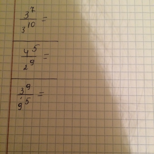 3) 3^9/9^5 = 3^9/(3²)^5 = 3^9/3^10 = 3^(9-10) = 3^(-1) = 1/3¹ = 1/3