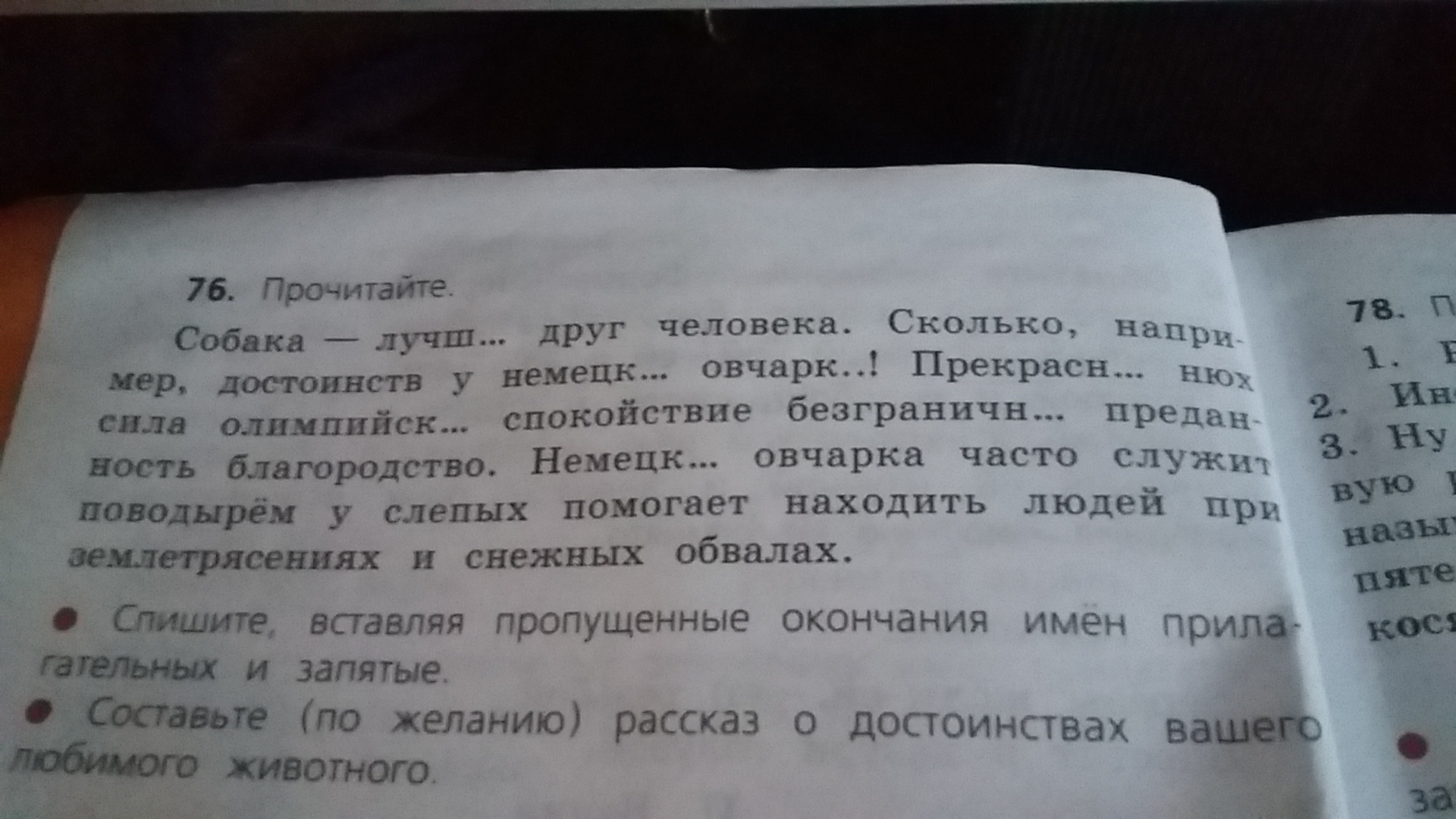 Собака - лучший друг человека. Сколько, например, достоинств у немецкой овчарки! Прекрасный нюх, сила олимпийская, спокойствие, безграничная преданность, благородство. Немецкая овчарка часто служит поводырем у слепых, помогает находить людей при землетрясениях и снежных обвалах.