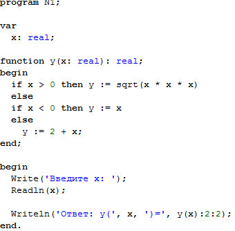Writeln('Ответ: y(', x, ')=', y(x):2:2);