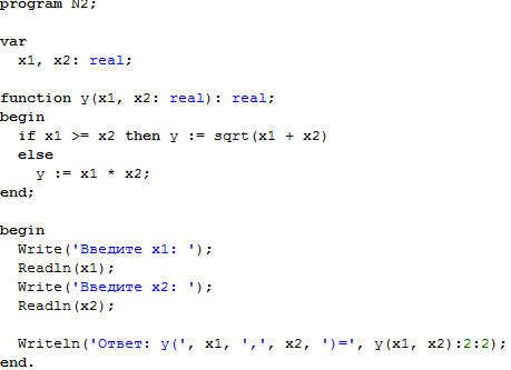 Writeln('Ответ: y(', x1, ',', x2, ')=', y(x1, x2):2:2);