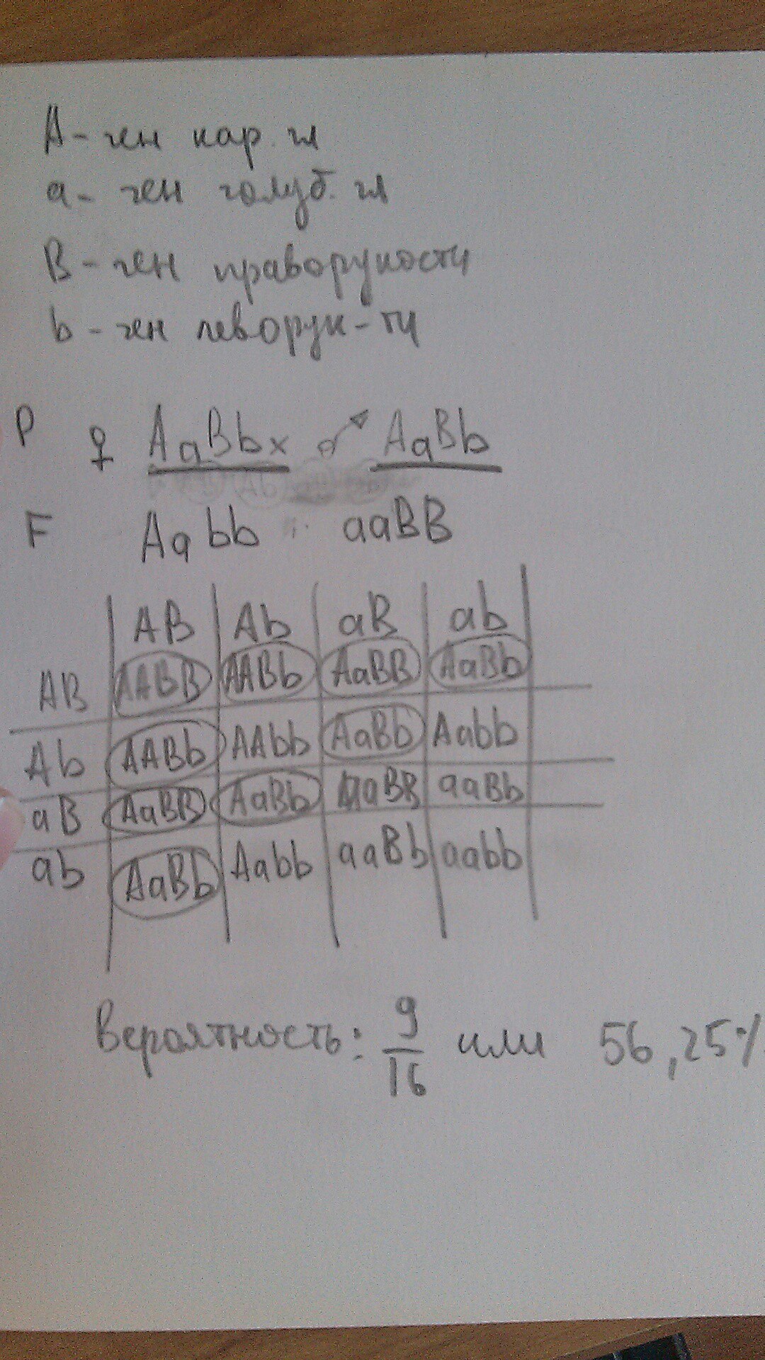 В семье кареглазых праворуких родителей родились разнояйцевые близнецы, один из которых кареглазый левша, а другой голубоглазый правша. Какова вероятность рождения следующего ребенка, фенотипически похожим на своих родителей? Рождение у кареглазых родителей голубоглазого ребенка свидетельствует о рецессивности голубой окраски глаз, а рождение у праворуких родителей леворукого ребенка указывает на рецессивность лучшего владения левой рукой по сравнению с правой. Запишем схему брака.