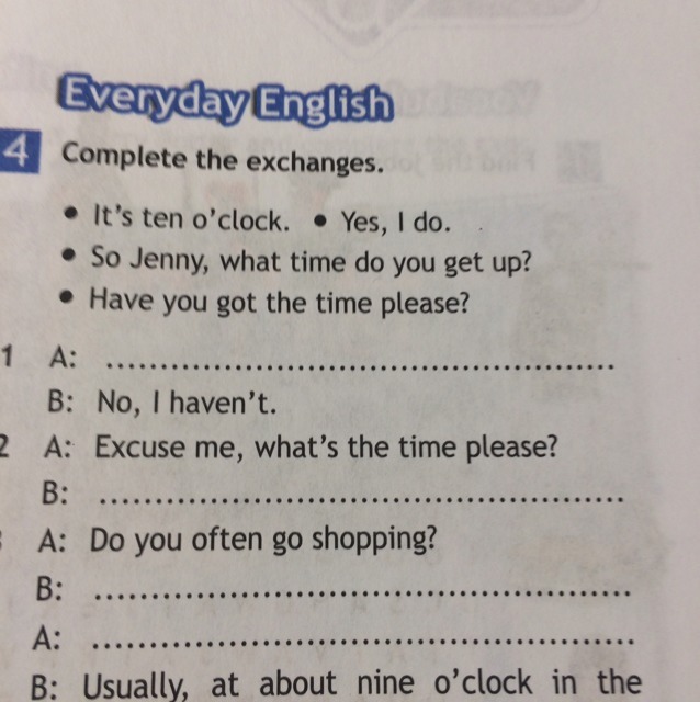 1)have you got the time pleace.2)itisten o clock 3)yes i do4)so jenny,what s the time pleace