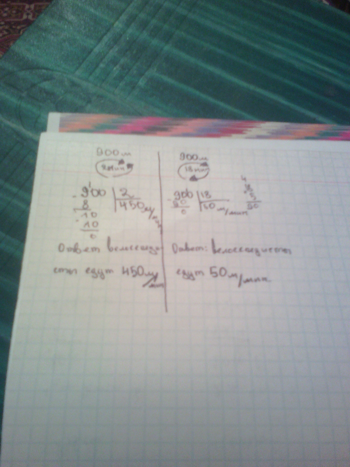 Два велосипедиста едут велотреком ,имеющим длину 900 м. Они встречаются каждые 2 мин. ,если движутся в противоположных направлениях,и через каждые 18 мин