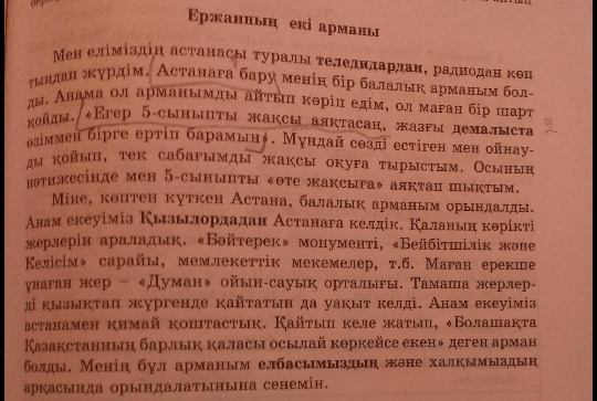 2)Ержанның анасы қандай уәде берді ? (Что обещала мама Ержану) ответ: Его мама обещала, что если ты будешь хорошо учиться, я заберу тебя в Астану.