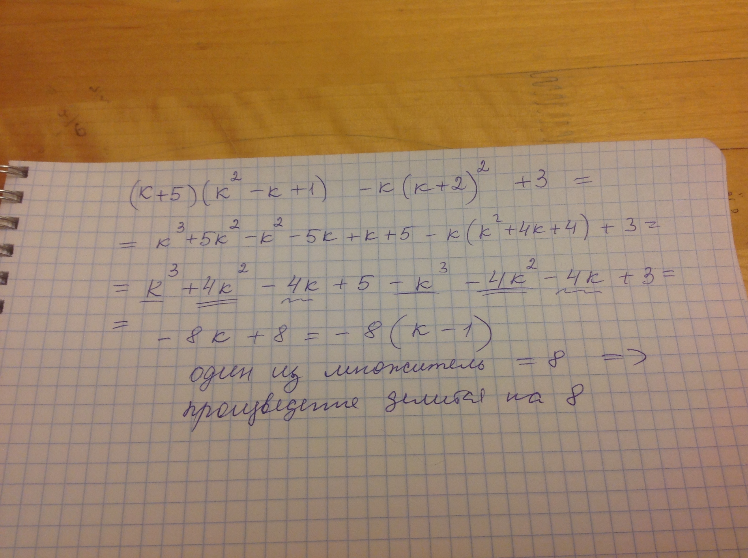 (K + 5) (kв 2 степени -k + 1) -k (k + 2) в квадрате + 3 Докажите что при каждом целом k значение выражения делится на 8 Прошу помогите!