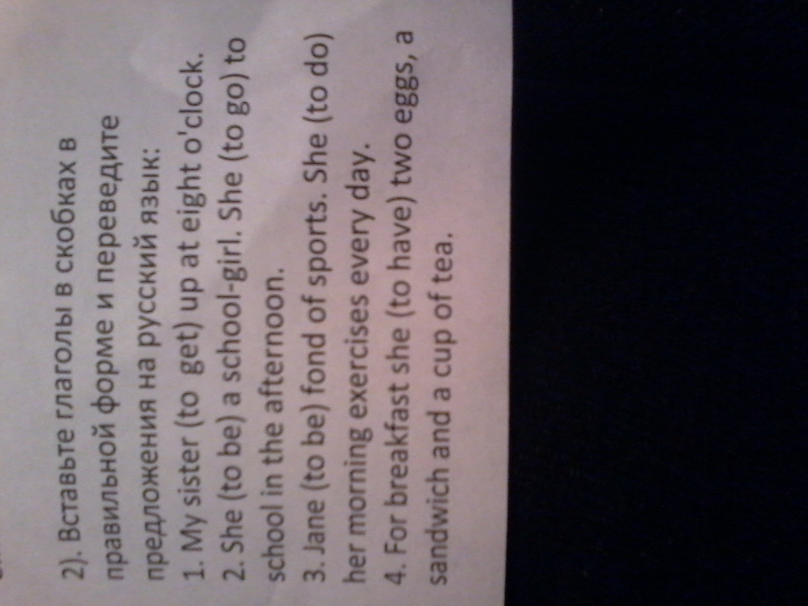 Моя сестра встает в 8 часов. она школьница.она пойдет в школу этим вечером. джейн любит спорт.она делает свою утреннию зарядку каждый день. на завтрак у нее 2 яйца, бутерброд и чашка чая.