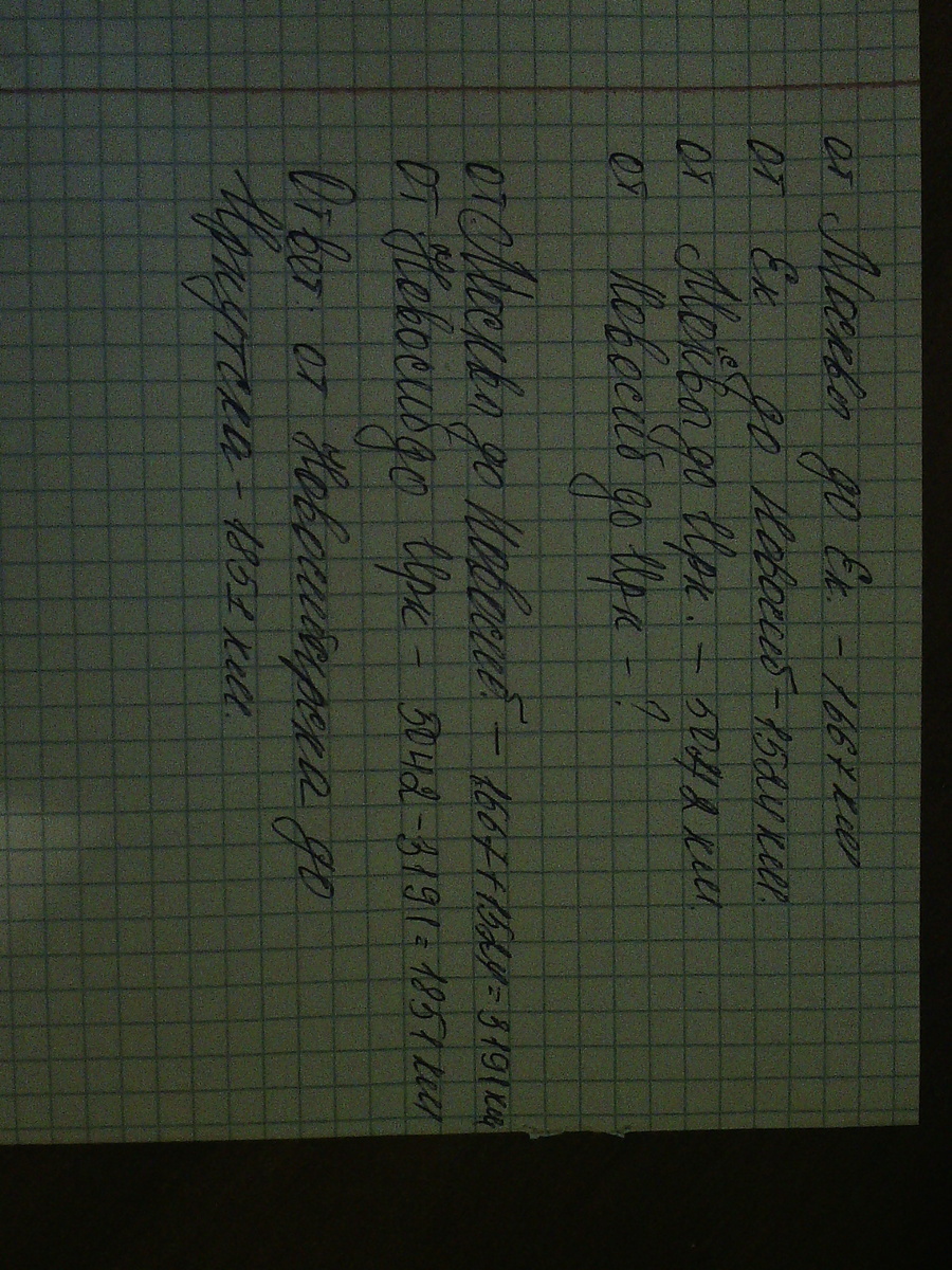 1)1667+1524=3191 км от Москвы до Новосибирска.2)5042-3191=1851 км от Новосибирска до Иркутска.Ответ:1851 км расстояние от Новосибирска до Иркутска.