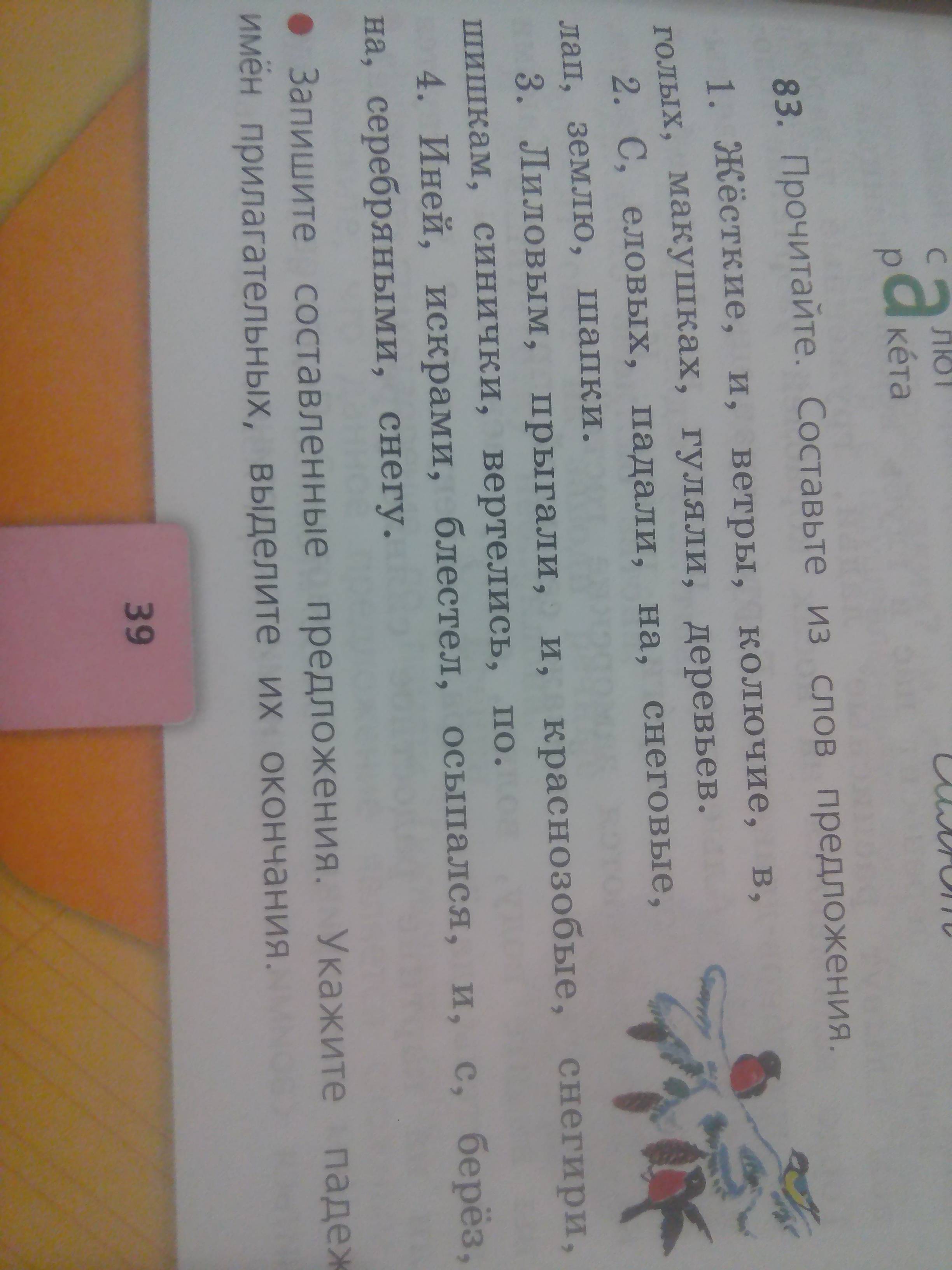 1)Жесткие ветра гуляли в голых и колючих макушках деревьев.2) С еловых лап падали на землю снеговые шапки.3) По лиловым шишкам прыгали, вертелись краснозобые снегери и синички.4) Иней на снегу блестел и осыпался с берез серебряными искрами.