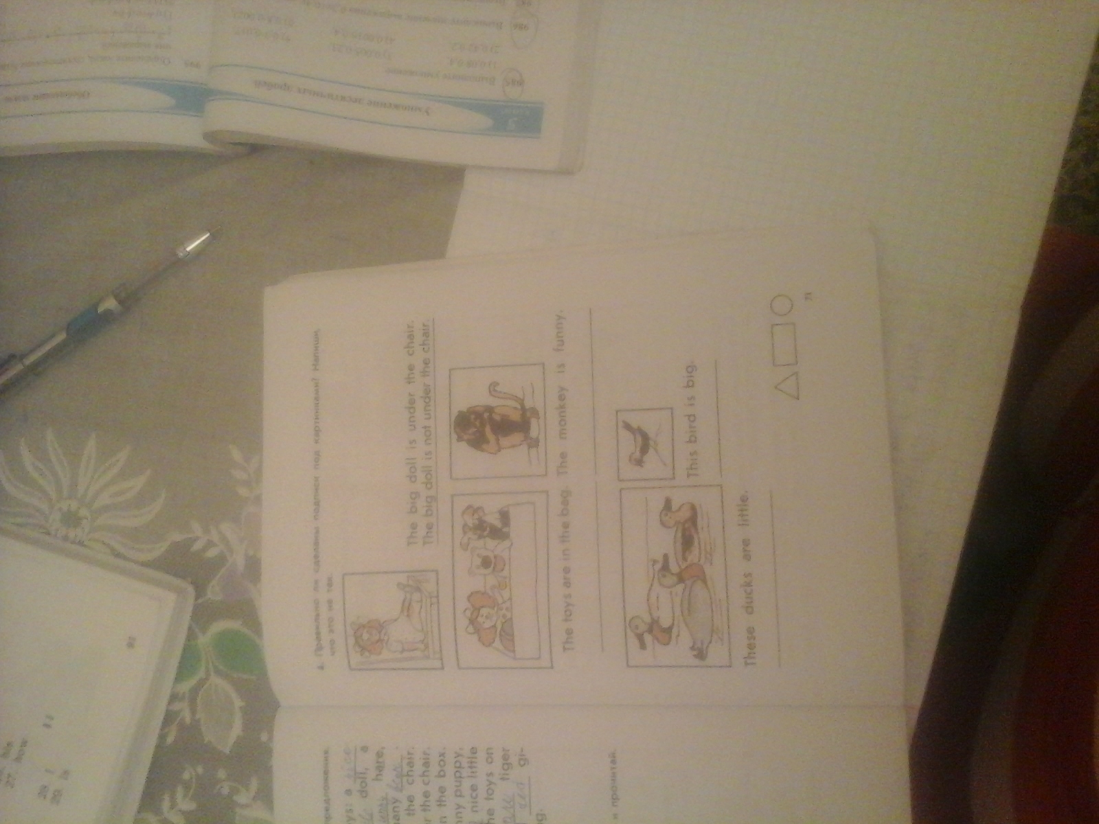 the big doll on chair the toys in the box the monkey is tired threse duck a big the bird is small