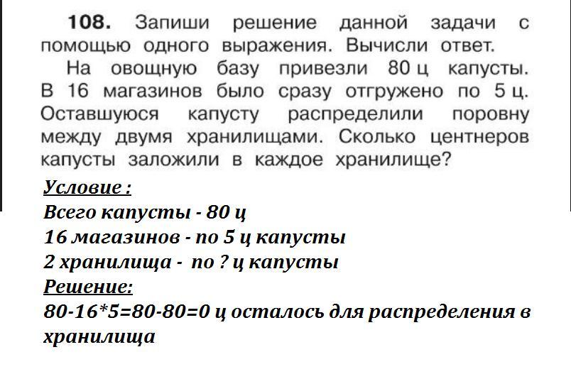 На овощную базу привезли 80 ц капусты.В 16 магазинов было сразу разгружено по 5 ц . Оставшуюся капусту распределили поровну между двумя хранилищами. Сколько центнеров капусты заложили в каждое хранилище ?