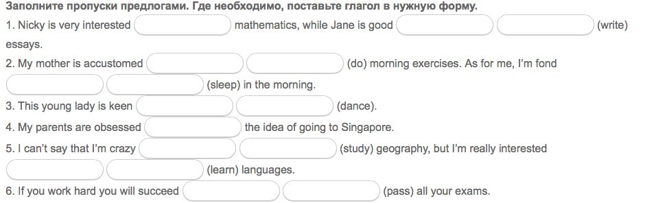 in, at, writing, to, do, of, sleeping, keen on, dancing, with, about, studying, in, learning, in, passing.