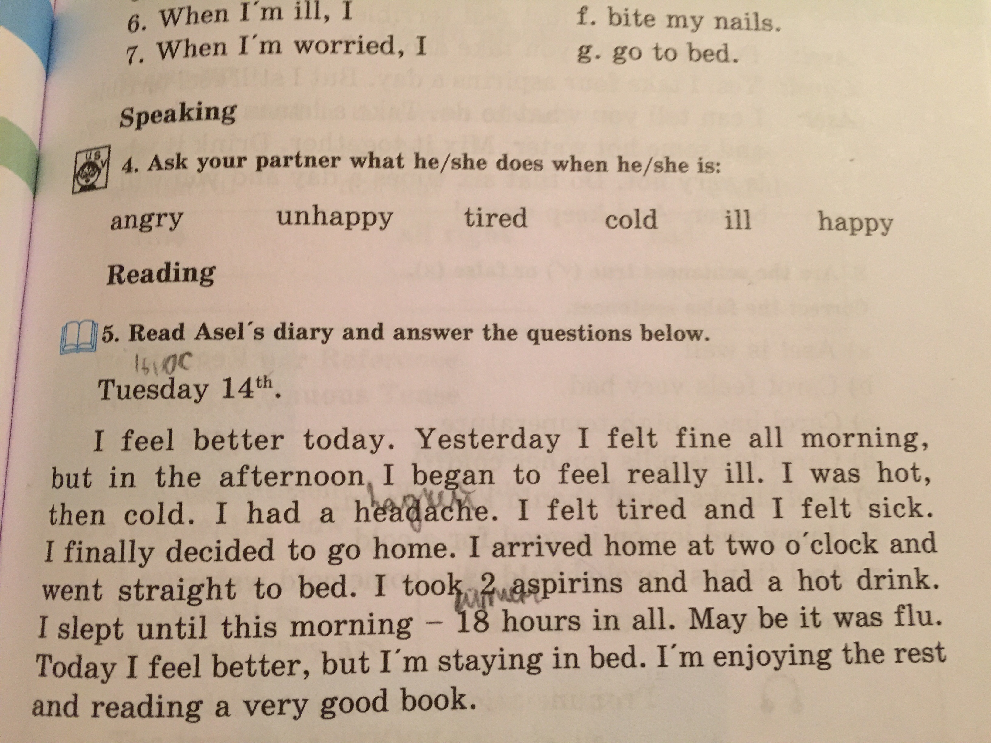 Сегодня мне лучше . Вчера мне было хорошо всё утро,но днём.Я почувствовала сильную боль.Мне было то жарко,то холодно.У меня болела голова.Я устала и я заболела.Наконец решила пойти домой.Я возвратилась домой в 2 часа и сразу пошла в кровать.Я уснула до утра-вообщем 18 часов.Может быть это был грипп.Сегодня мне лучше,но я остаюсь в кровати.Я наслаждаюсь отдыхом и читаю очень хорошие книги