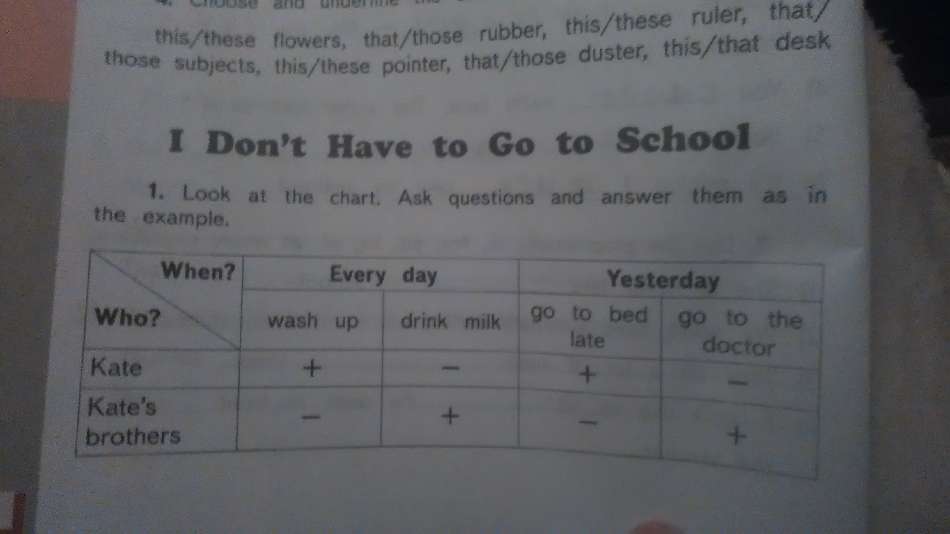 Look at the chart ask questions and answer them as in the example. Example 1 Does Kate have to wash up every day,Yes she to wash up every day. 2 Did Kate's brothers have to go to bed late ? - No, they didn't have to go to bed late . Помогите СРОЧНО по этому примеру сделать упр .