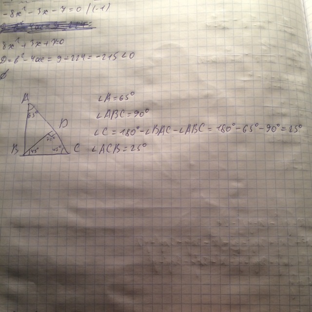 СРОООЧНО!!!!!!!! Помогите пожалуйста по геометрии! Задача : из вершины прямого угла треугольника ABC , проведена высота BD . Найдите треугольник CBD , если известно, что угол A равен 65 градусов