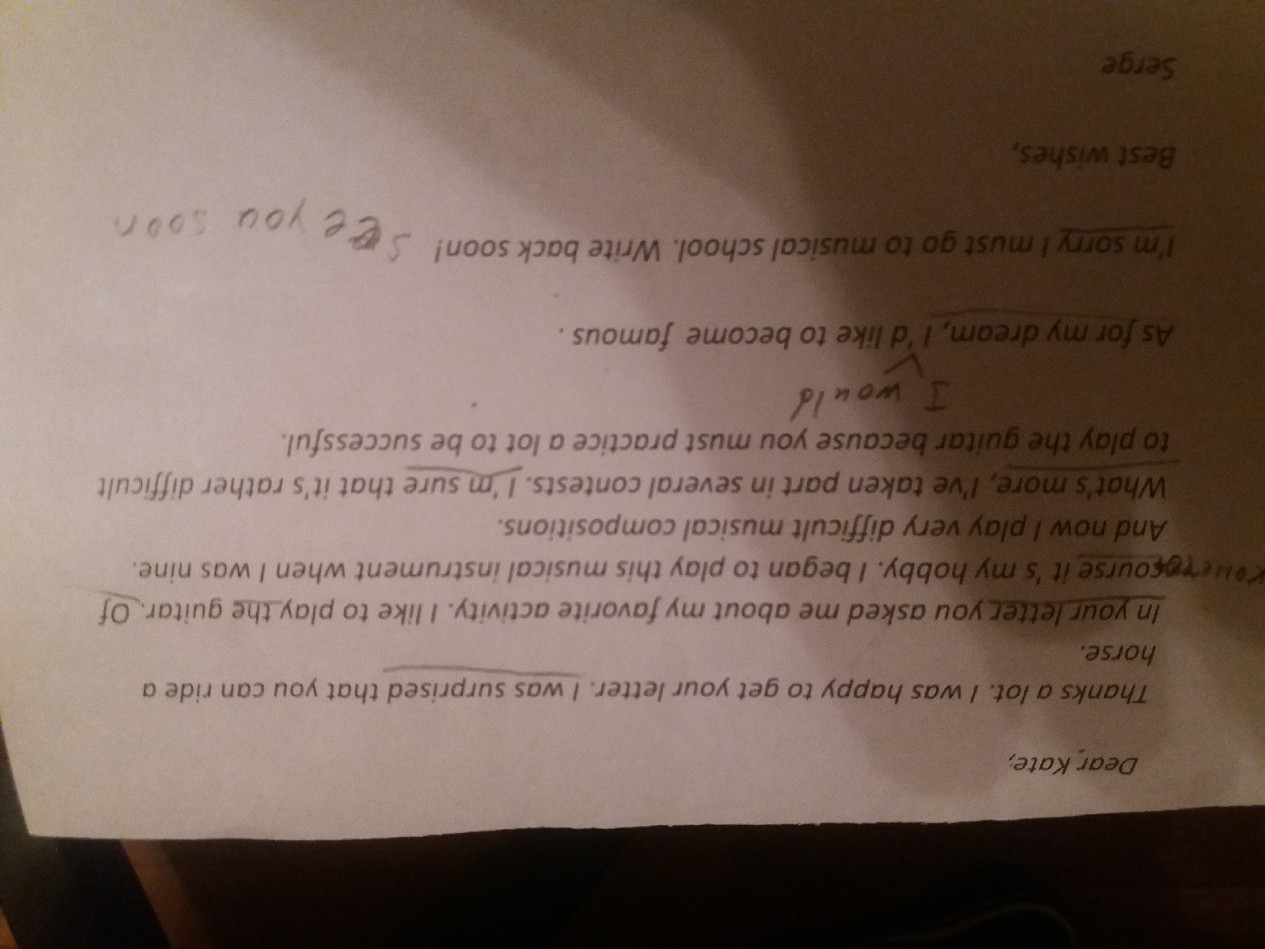 В своем письме ты спрашиваешь о моей любимой деятельности. Я люблю играть на гитаре, конечно, это мое хобби. Я н6ачал играть на этом музыкальном инструменте, когда мне было 9 лет. И сейчас я играю очень сложные музыкальные произведения.