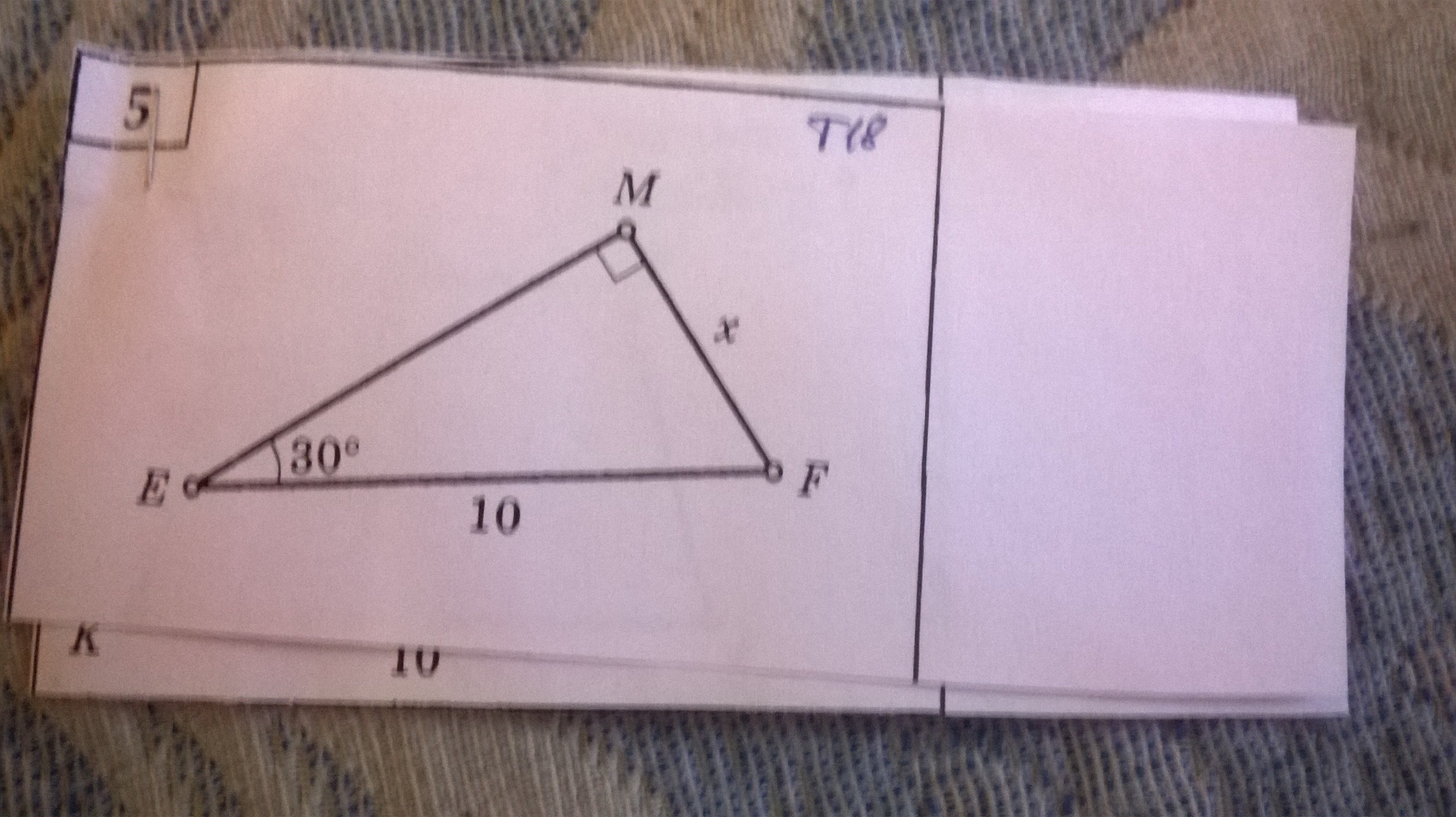 Записать модно так:"треугольник MEF прямоугольный,угол MEF=30 градусов=>MF=1/2FE=10/2=5"