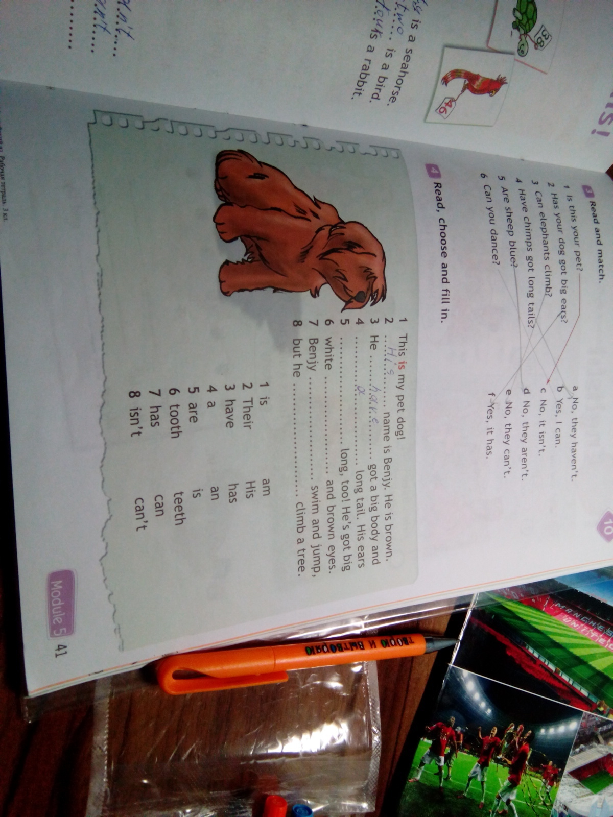 This is my pet dog! His name is Benjy. He is brown. He has got a big body and a long tail. His ears are long, too! He's got big white teeth and brown eyes. Benjy can swim and jump, but he can't climb a tree.