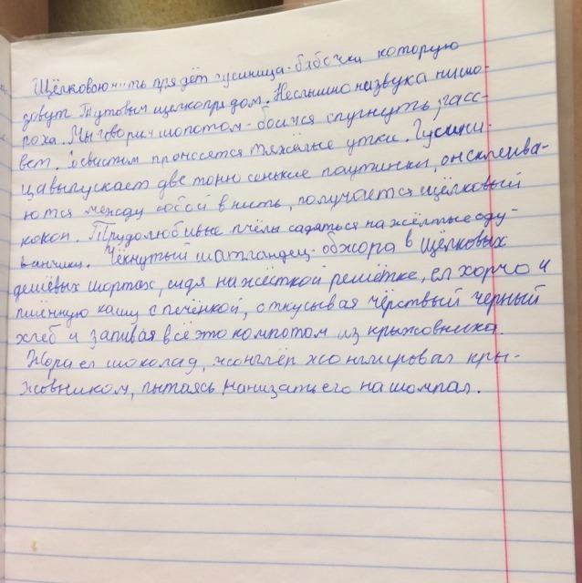 Шелковую(с буквой Е,а не Ё) нить прядёт гусЕница бабочки,которую зовут Таутовым шелкопрядом.Не слышно ни звука,ни шороха.Мы говорим шопотом - боимся спугнуть рассвет.Со свистом проносятся тяжёлые утки.ГусЕница выпускает две тонюсенькие паутинки,они склеиваются между собой в нить,получается шелковый кокон.Трудолюбивые пчёлы садяТСЯ на жёлтые одуванчики. Чекнутый шОтландец-обжора в шелковых дешёвых шортах,сидя на жесткой решётке,ел хорошо и пшенную кашу с печёнкой,откусывая чёрствый чёрный хлеб,и запивая всё это компотом из крыжовника.