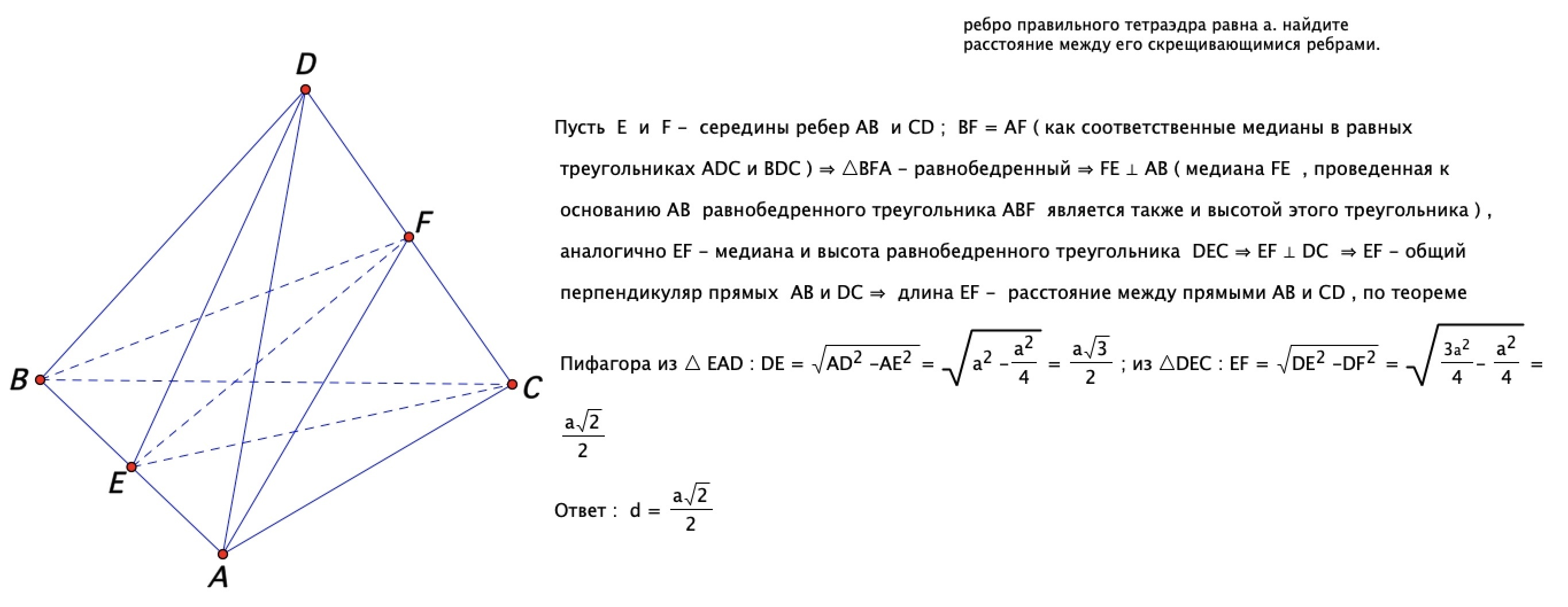 ребро правильного тетраэдра равна а. найдите расстояние между его скрещивающимися ребрами. можно с рисунком плиииз*