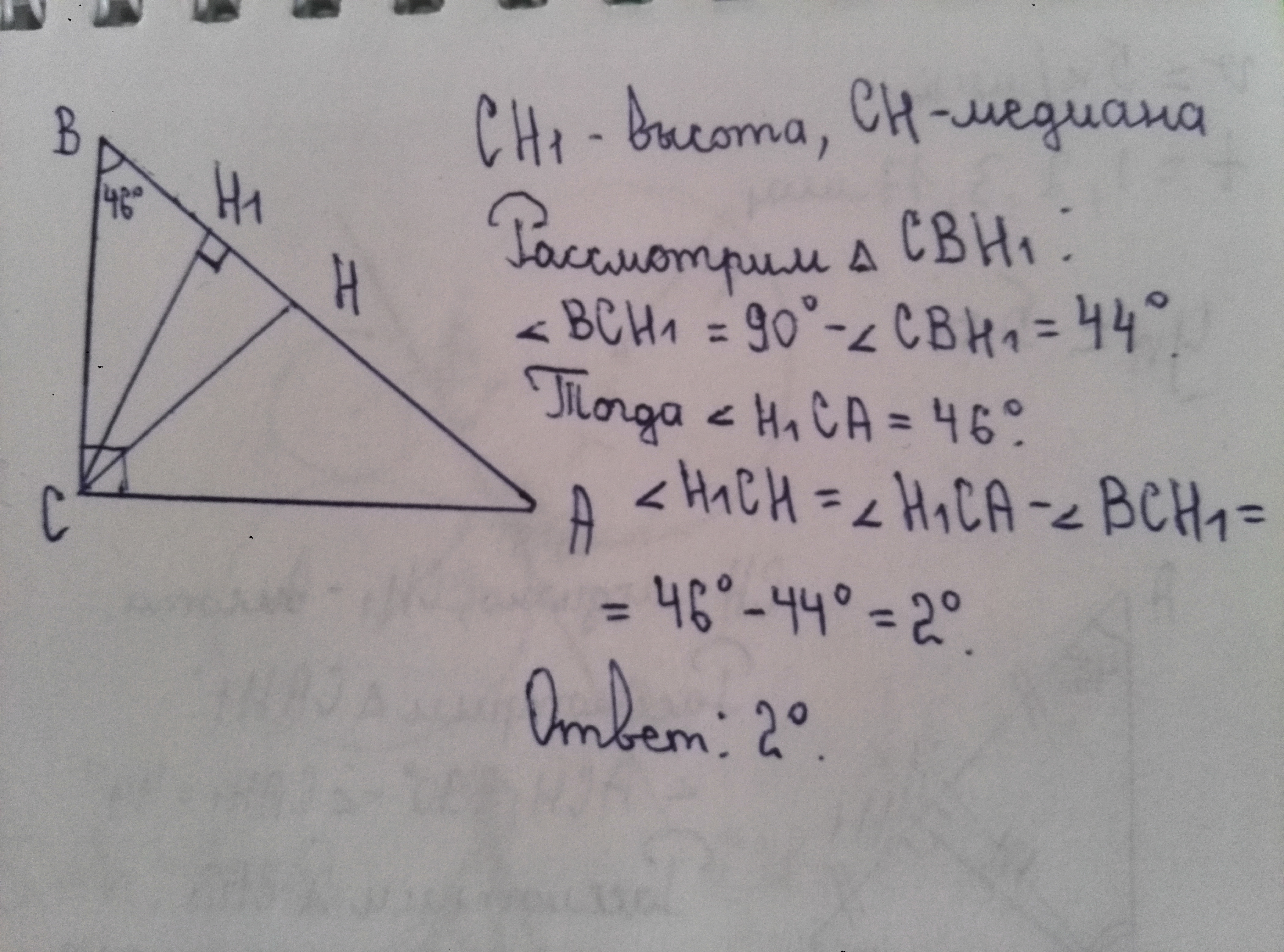 Один из острых углов прямоугольного треугольника равен 46°. Найдите градусную меру угла между высотой и медианой, проведённого из вершины прямого угла.