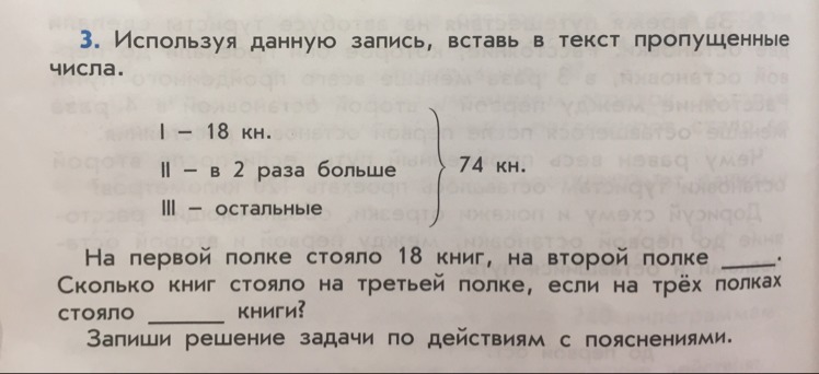 на первой полке стояло 18 книг, на второй полке 36. Сколько книг стояло на тпетьей полке, если на трех полках стояло 74 книги?