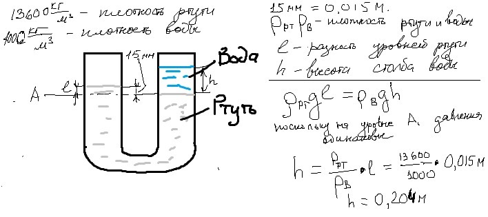 в сообщающиеся сосуды налили ртуть а поверх которой в одном из них находится вода разность уровней ртути 15мм найдите высоту столба воды