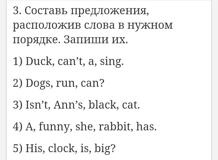 составить предложения из слов. 1 . duck sing a can,t 2, dogs run can 3 isn,t ann,s black cat 4 a funny she raddit has 5 his clock is big