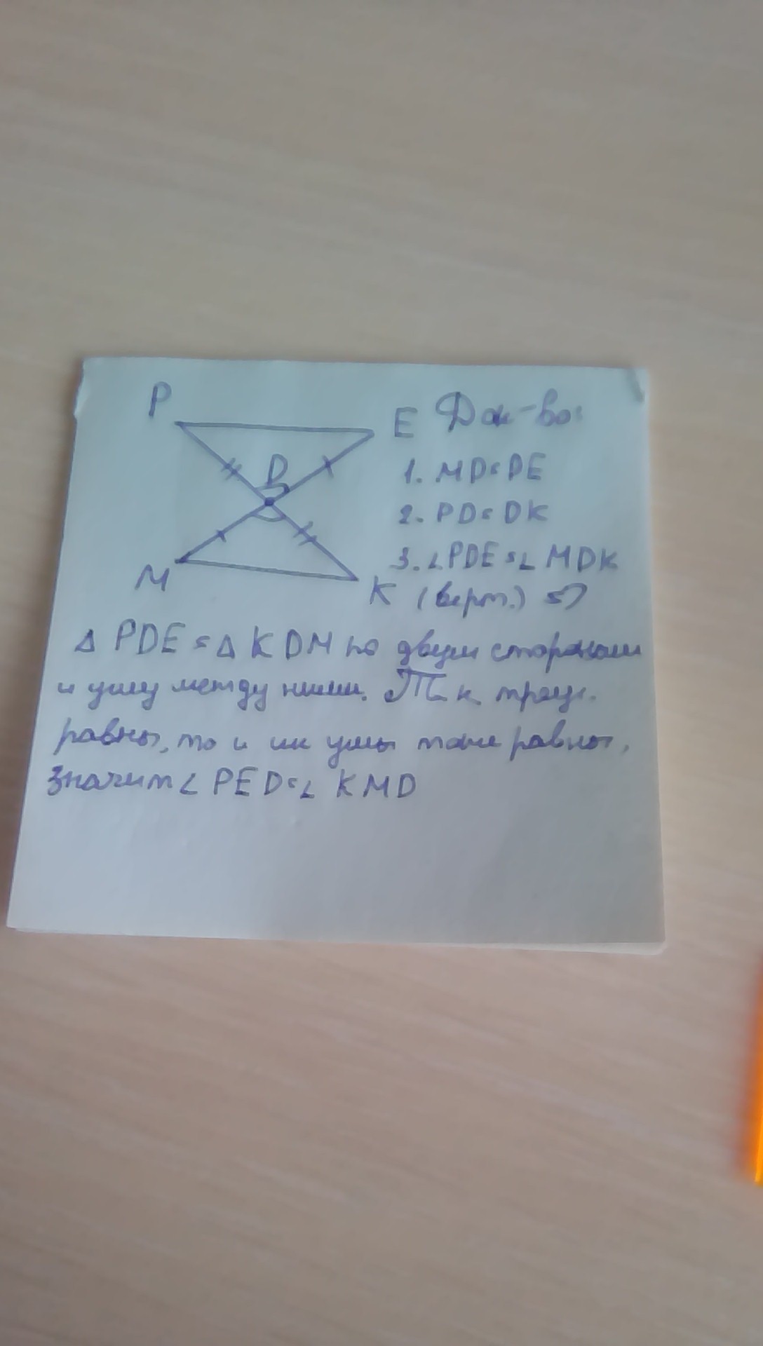 Отрезки МЕ и РК пересекаются в точке D, являющейся серединой каждого из них. Докажите, что: а) треугольники РDЕ и КDМ равны; б) PED=KMD.