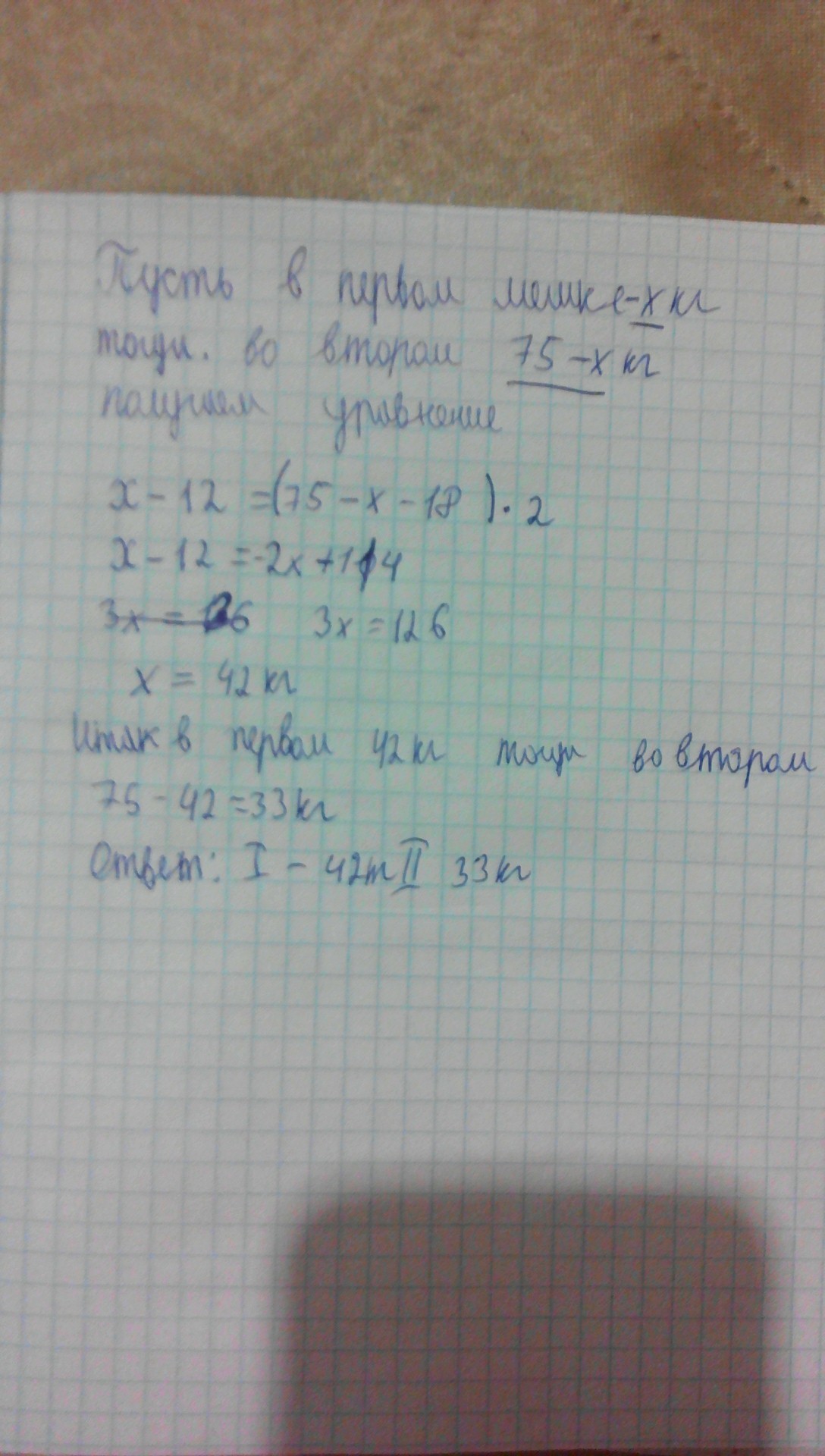 В двух мешках было 75 кг крупы. После того как из первого мешка продали 12 кг , а из второго 18 кг, в первом мешке крупы оказалось в 2 раза больше, чем во втором.Сколько килограммов крупы было в каждом мешке первоначально?