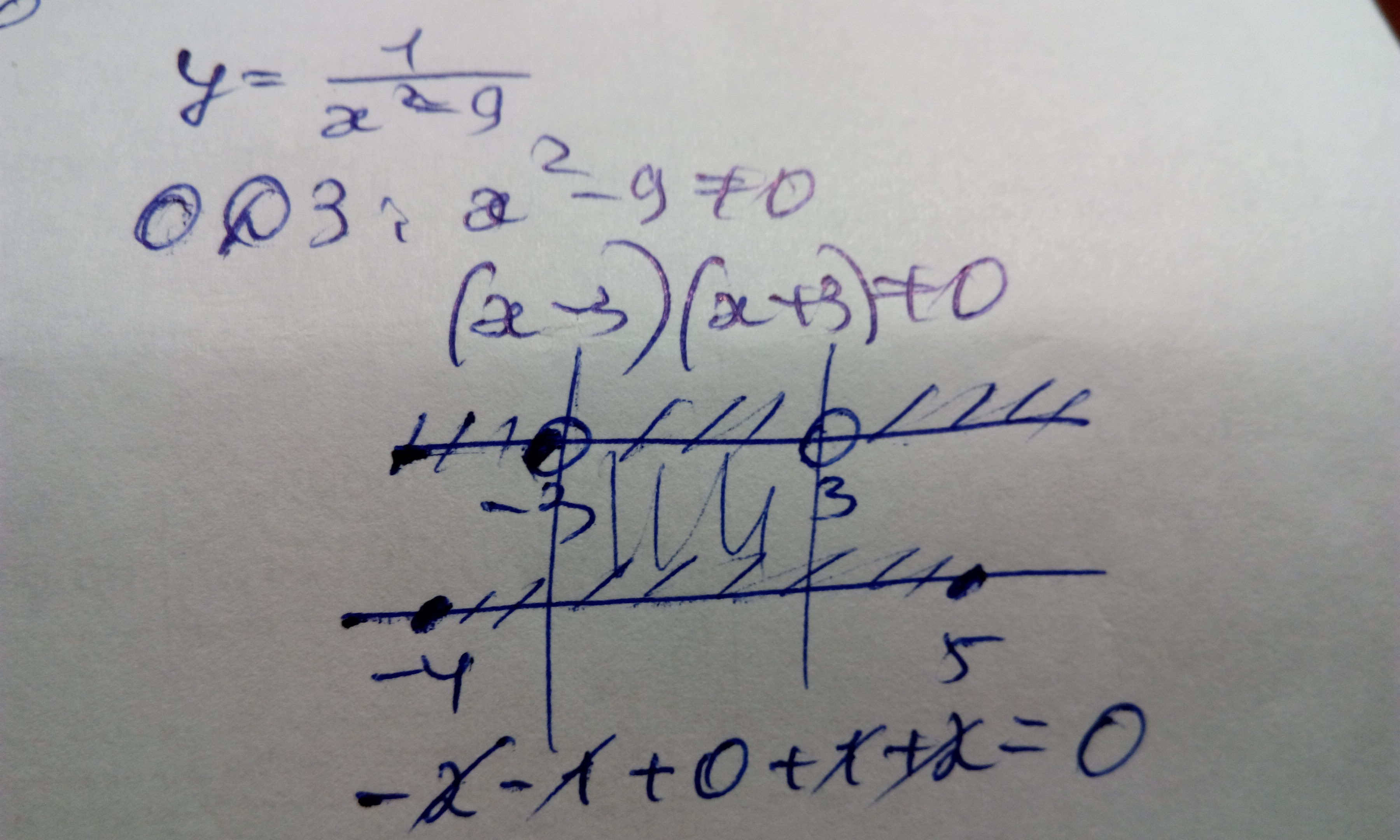 Найти область определения функции и в ответе указать сумму целых значений x: y=1x^2-9 на отрезке [-4;5]