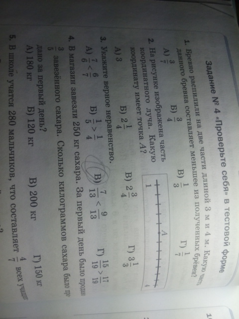 Каждое деление составляет 1/4, следовательно точка А=5*1/4=5/4=2 1/4
