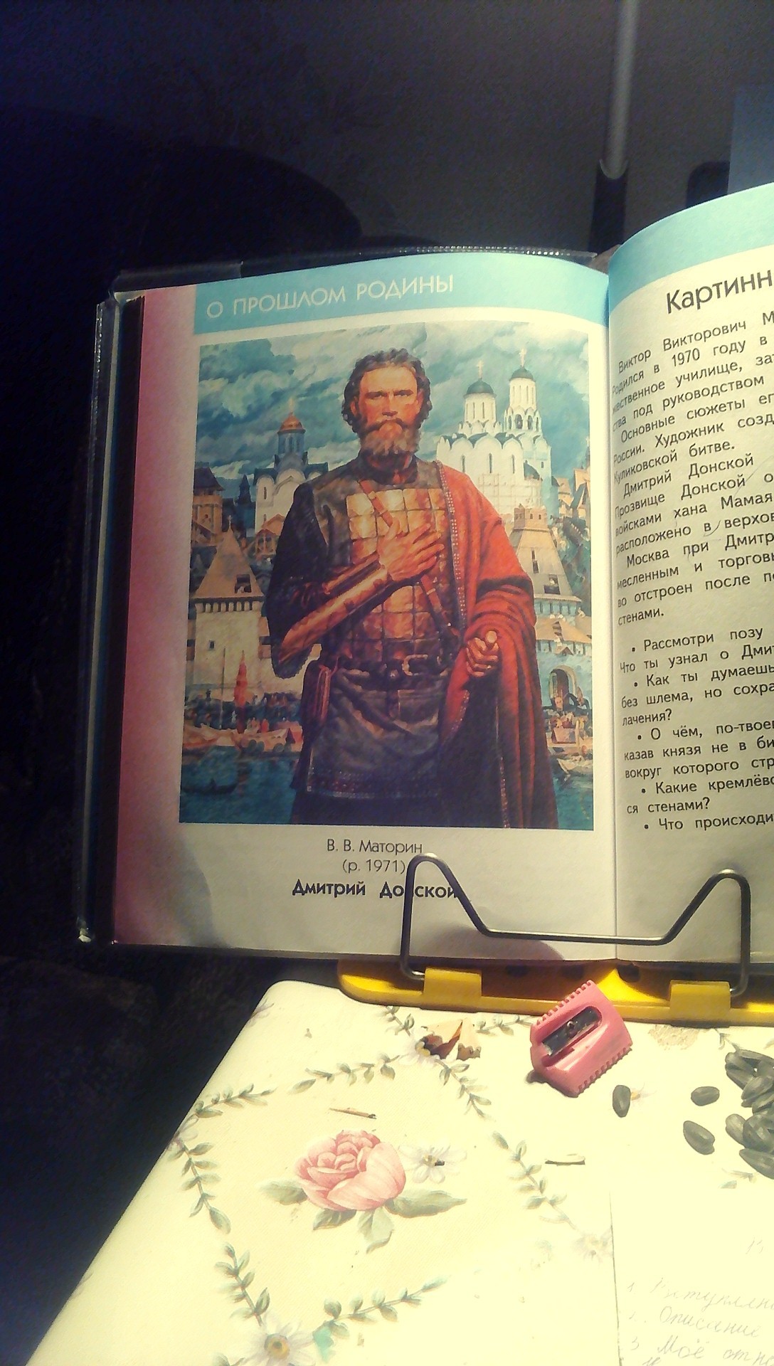 Донской изображен с правой рукой на сердце. Это достаточно символично, ведь за его спиной находится народ, который верит ему, родные церкви и дома, за которые он готов сражаться до конца. И это прослеживается по картине, ведь, смотря на Донского, обязательно понимаешь, что этот человек любит свою родину и народ, точно также как и они его, а, значит, ему есть за что отдать даже свою жизнь – за правду и свободу.