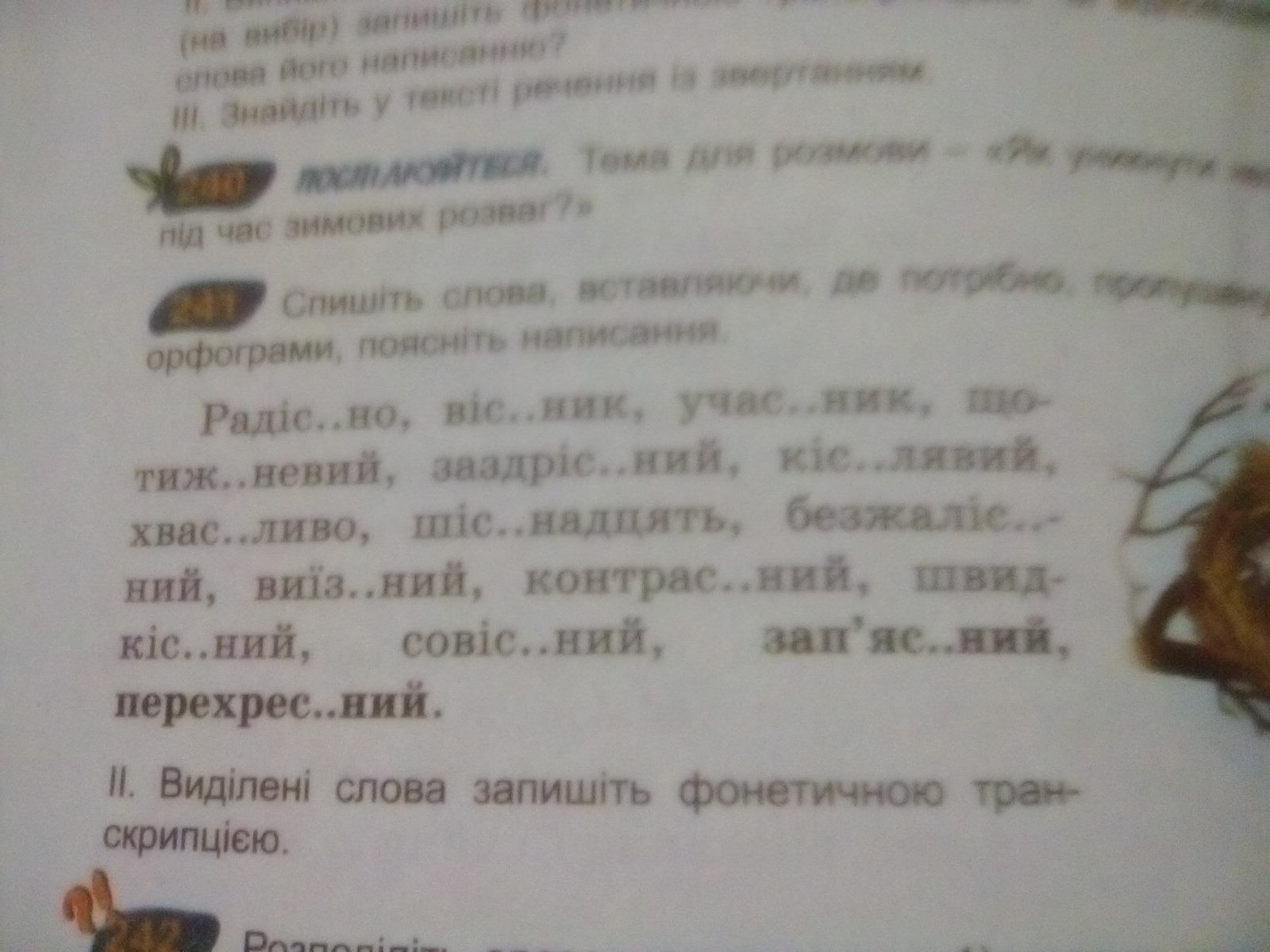 Радісно, вісник, участник, щотижневий, заздрісний, кістлявий, хвастливо, шістнадцять, безжалісний, в'їзний, контрастний, швижкісний, совісний, зап'ястний, перехрестний