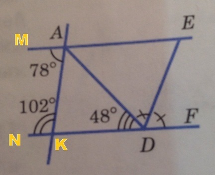∠ADK = ∠EAD = 48° - накрест лежащие углы при AE║KD и секущей AD