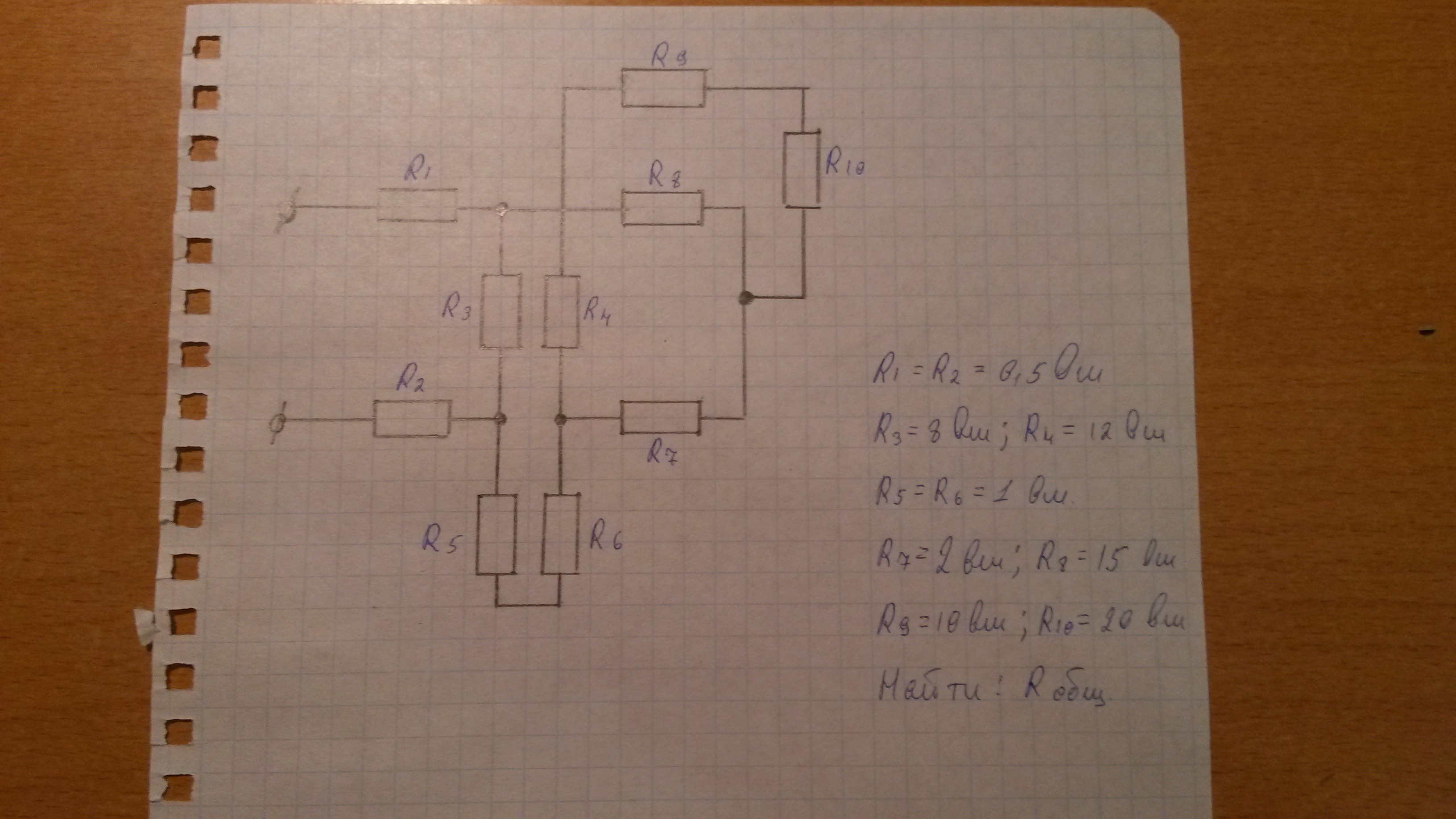 Надо найти R общее. жирная точка это соединение проводников, где нет точки значит проводник не соединен. пустая перечеркнутая точка это источник тока. все данные есть на фото