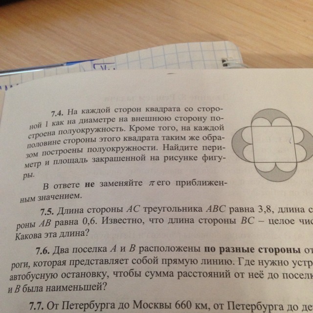 На каждой сторон квадрата со стороной 1 как на диаметре на внешнюю сторону построена полуокружность