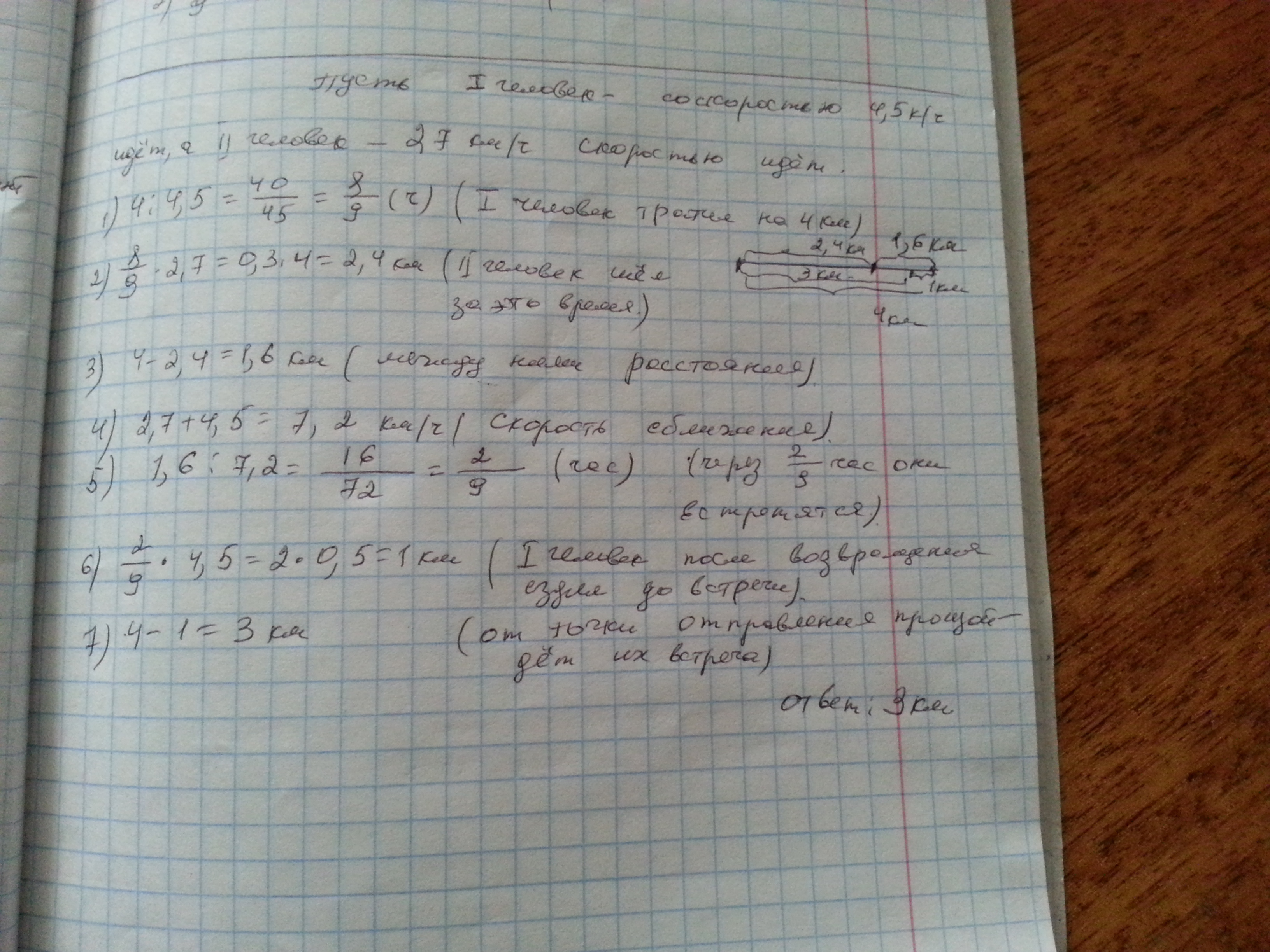 4)1,6/2,7+4,5=1,6/7,2=2/9(ч)-2-й путник идет навстречу 1-ому.