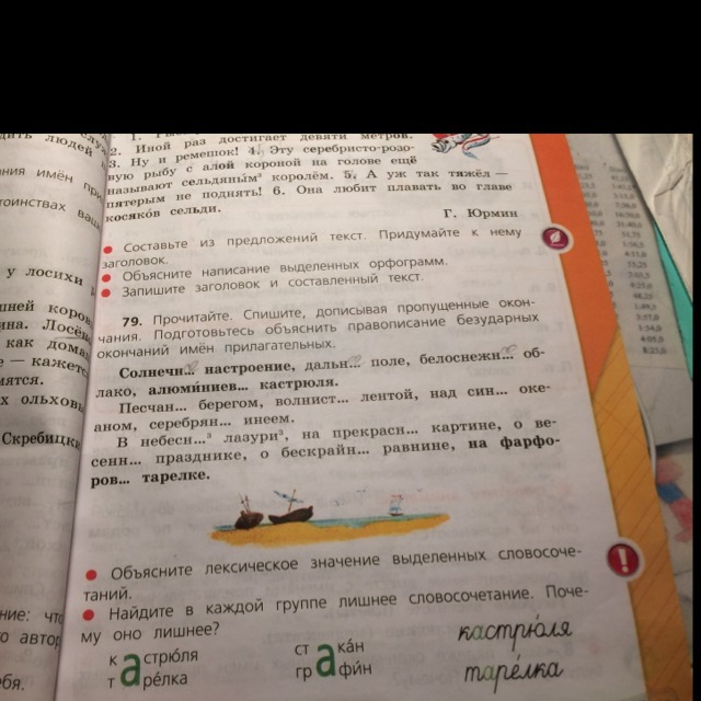 алюминиевАЯ кастрюля, песчанЫМ берегом, волнистОЙ лентой, над синИМ океаном, серебрянЫМ инеем, в небеснОЙ лазури, на прекраснОЙ картине, о весеннЕМ празднике, о бескрайнЕЙ равнине, на фарфоровОЙ тарелке.