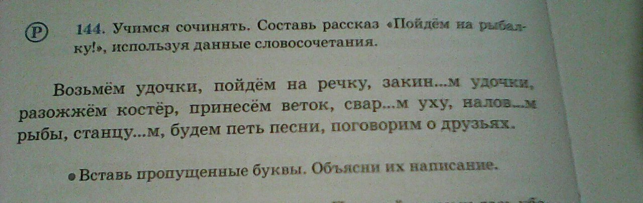 Один раз я с дедушкой пошли на рыбалку. Мы взяли удочки и подошли к речке.Потом закинули удочки. Ждали и вот наловили рыбки. Я принёс ветки. Дедушка разжёг костёр. И сварили уху. Уха была вкусной. Дедушка говорил о друзьях. Мы пели песни у костра.Рыбалка была хороша