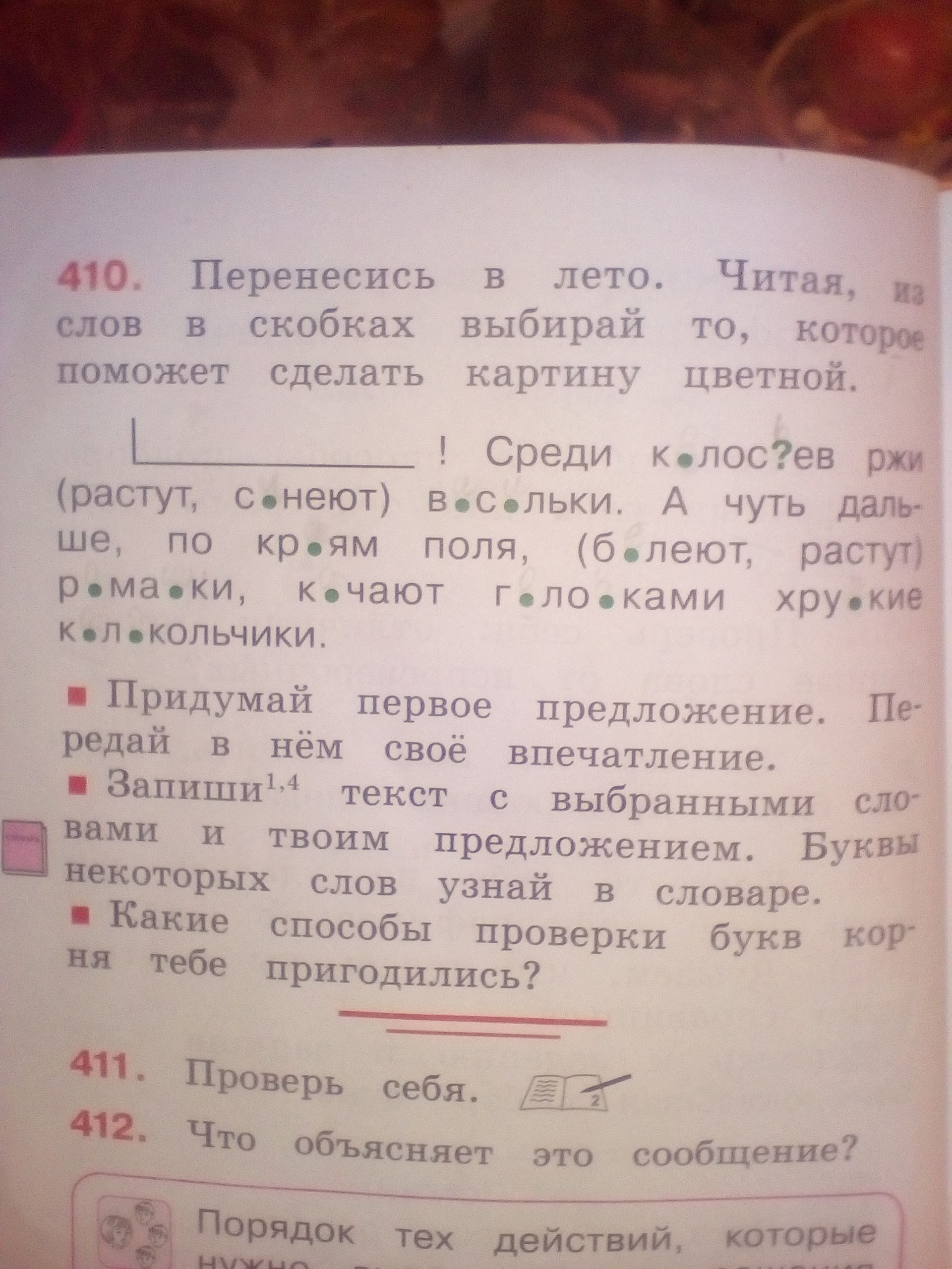 Ответ Среди колосьев ржи синеют васильки . А чуть дальше , по краям поля , растут ромашки , качают головками хрупкие колокольчики .