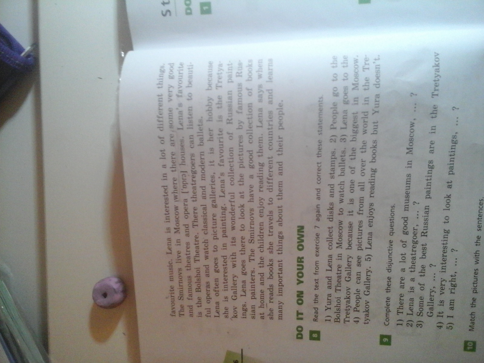 любимая музыка.В Sinirnovs живу в Москве, где есть искусствоа также известные театры и оперы (опп) домЛенлюбимые- Большой театр. Там театралов можете слушать красавчикул оперы и смотреть классического и современного балетаЛена часто косули в картинных галереях. это ее хобби быть КалиЛюбимый Леныко. Галерея с его замечательной коллекцией русскогоингс Лена идет туда, чтобы посмотреть на картины известныхруских Смирновых имеют хорошую коллекцию книгдома и дети с удовольствием читают их. Лена говорит чтоона читает книги, она путешествует по разным странам узнаватьмного важных вещей о них и их людей