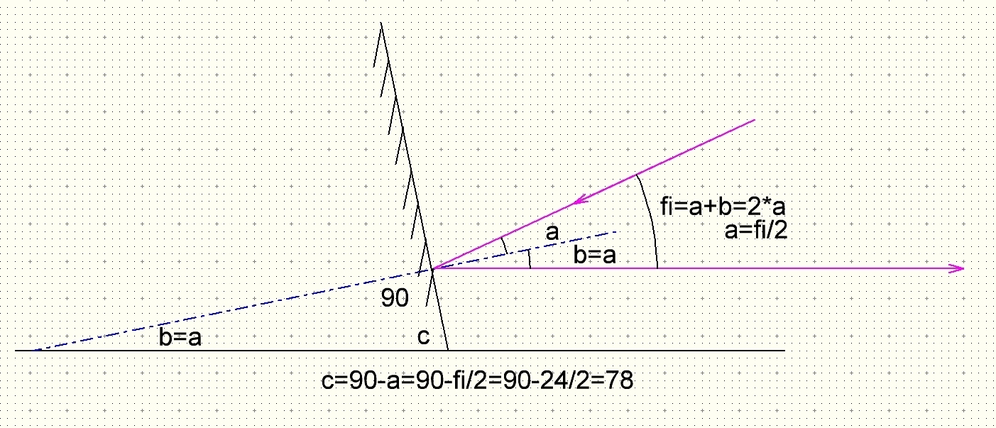 угол падения а равен углу отражения b. искомый угол равен с = 90 - fi/2 = 90-24/2 = 78