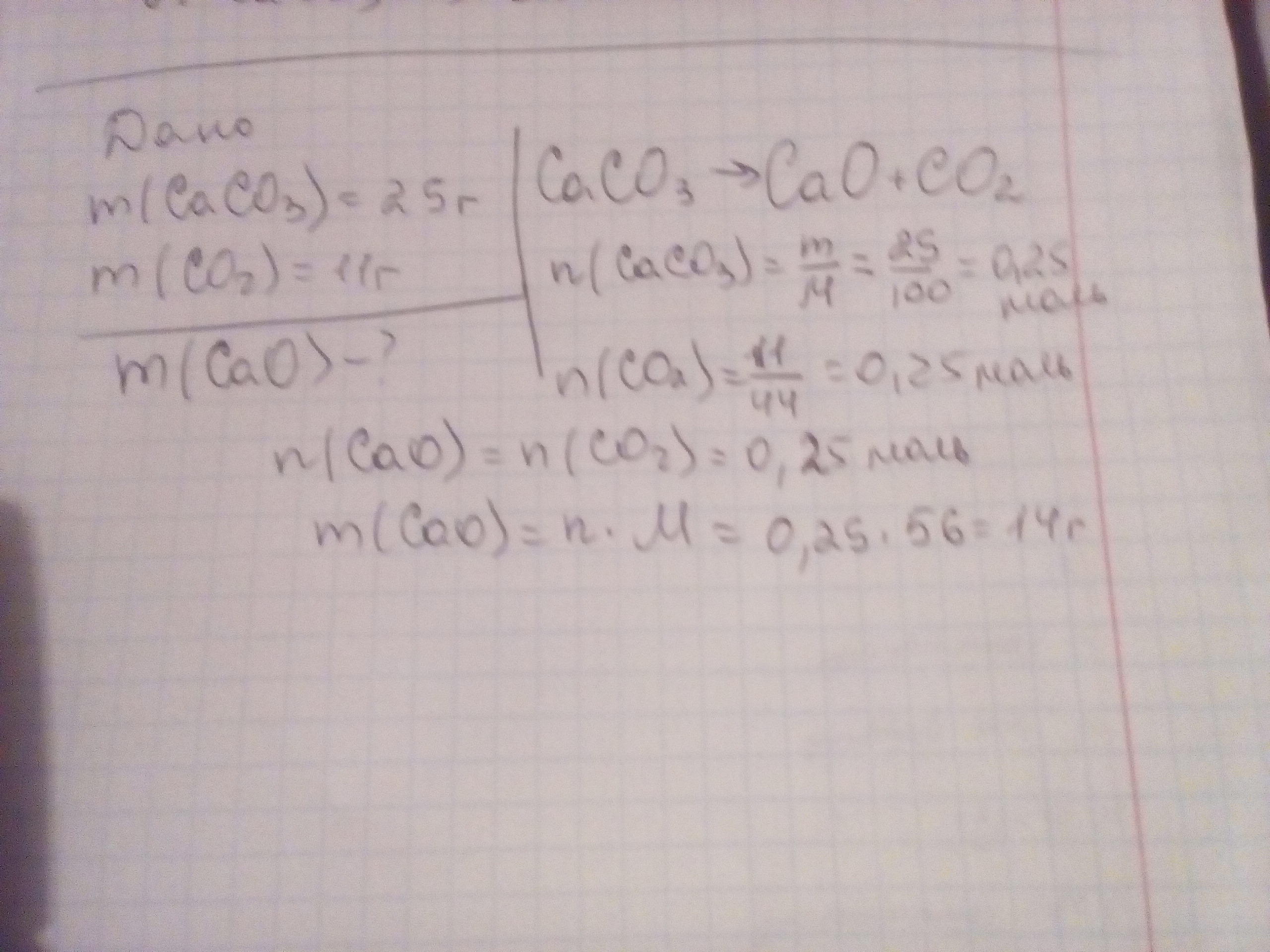 Яку масу негашеного вапна було добуто при тривалому прожарюванні 25г крейди, якщо крім вапна утворилося 11г вуглекислого газу?