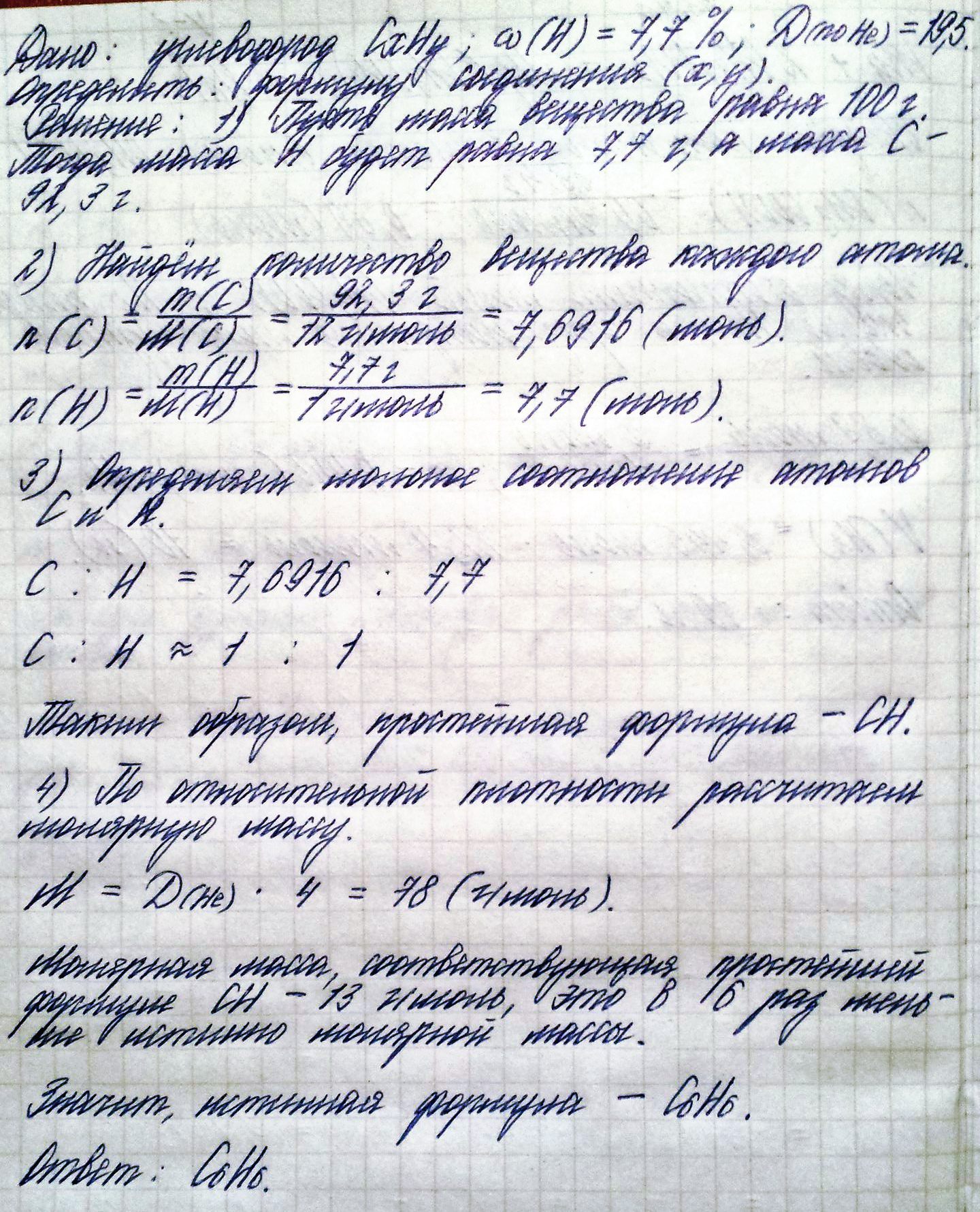 Визначте формулу вуглеводню, що містить 7,7% Гідрогену, а густина його пари за гелієм складає 19,5.