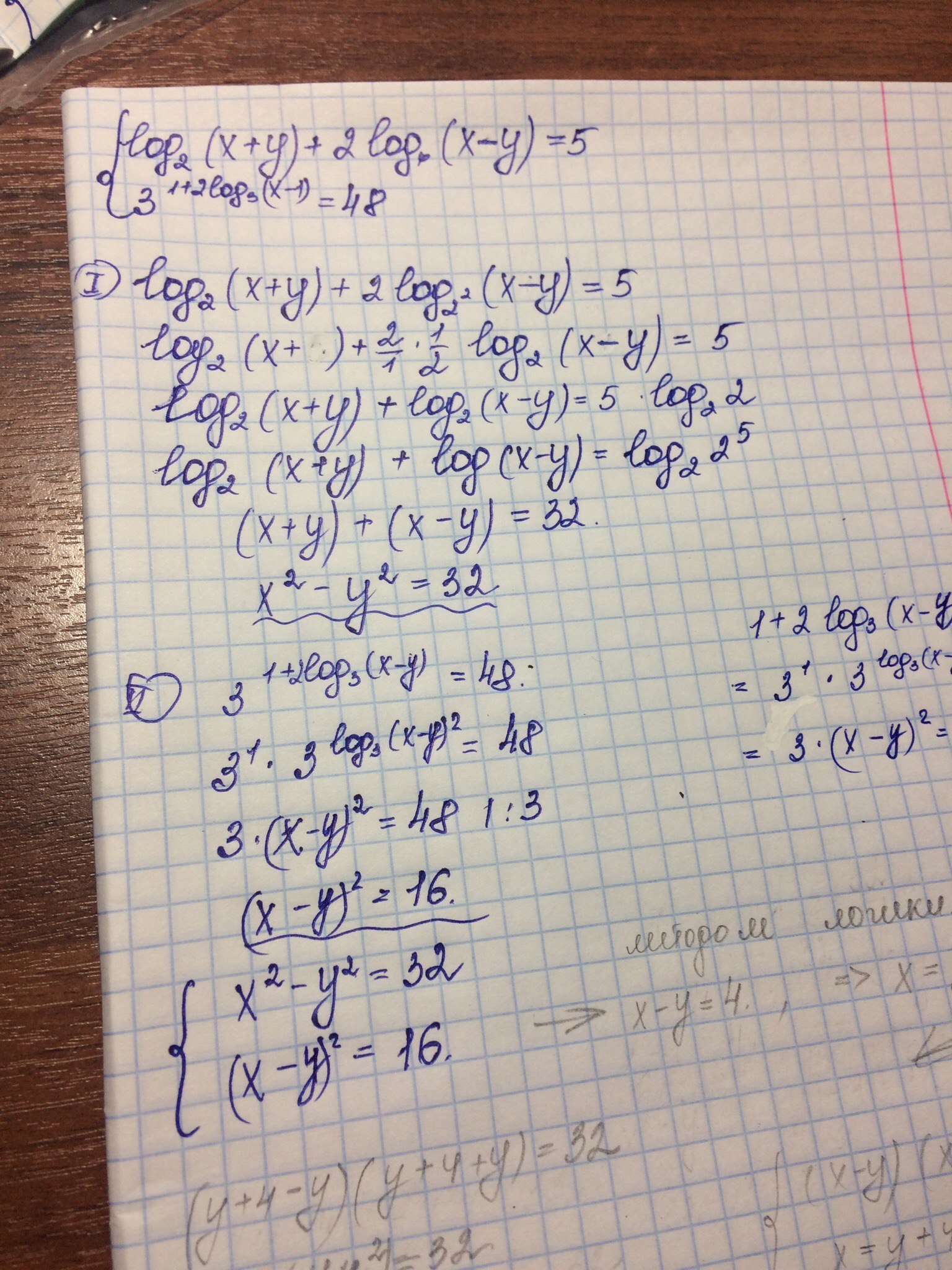 {3*3^log(3)(x-y)²=48⇒3^(log(3)(x-y)²=16⇒(x-y)²=16