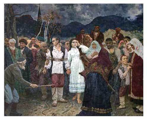 На картине изображен(а) плохая погода,горы,деревья,народ.Сбоку виден старик с плеткой а рядом связанный мужчина. Походу мужчину будут наказывать,а рядом стоит его жена.