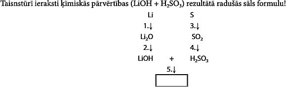 Taisnstūrī ieraksti ķīmiskās pārvērtības (LiOH + H2SO3) rezultātā radušās sāls formulu!