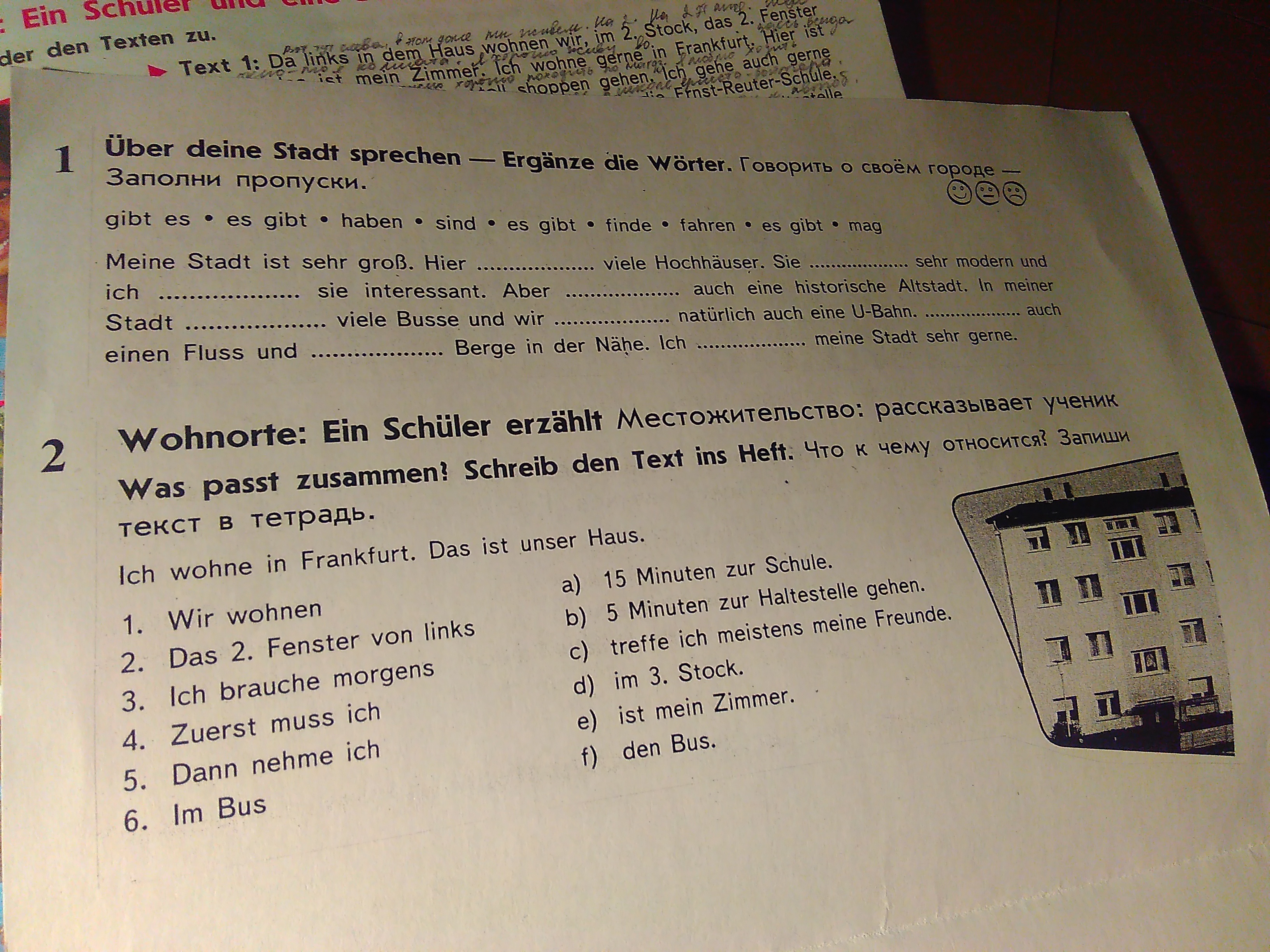1 Hier gibt es viele Häuser. 2 sie sind sehr modern und ich finde sie interessant. 3 aber es gibt auch eine historische Altstadt. 4 In meiner Stadt fahren viele Busse und wir haben natürlich auch eine U-Bahn. 5 es gibt auch einen Fluss und sind viele Berge 6 ich mag