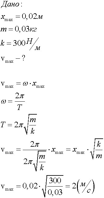 Груз с массой 30 г подвешен на пружине с жесткостью 300 Н/м. Если амплитуда груза 2 см, то максимальная скорость приобретаемая грузом равна